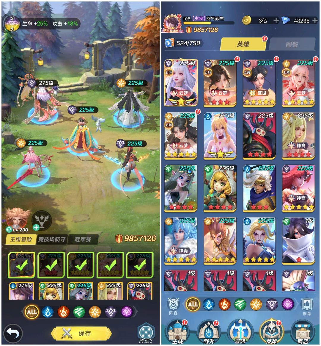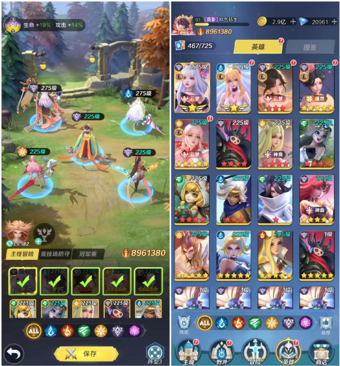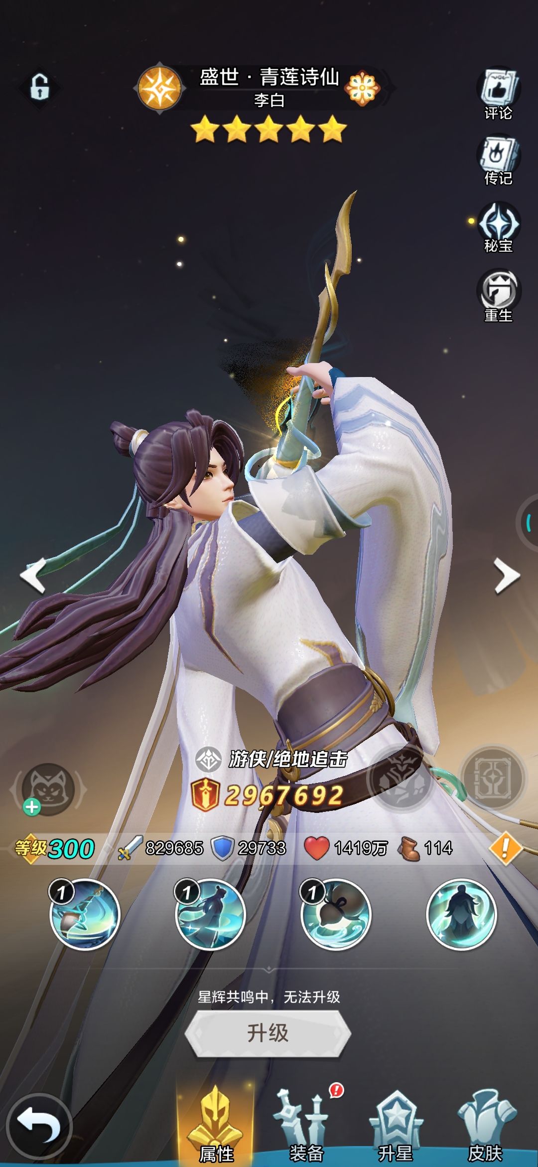 实战效果 很迫切的换上了9星李白,然后又快速的放包里了。目前个人阵容战力在6000万左右,下掉神官换上李白,打跨服段位赛(前10的样子)100次左右,胜率不到30%,没下的时候胜率在67%左右。同一个对手时赢时输,也能越战几百万,不大稳定,马上就下了,还是等11星激活转职加有专属神兵后再上。 目前的阵容如下: 李白在包里: 阵容搭配思路 目前的大环境建议2~3核心输出(新区非大氪的化,资