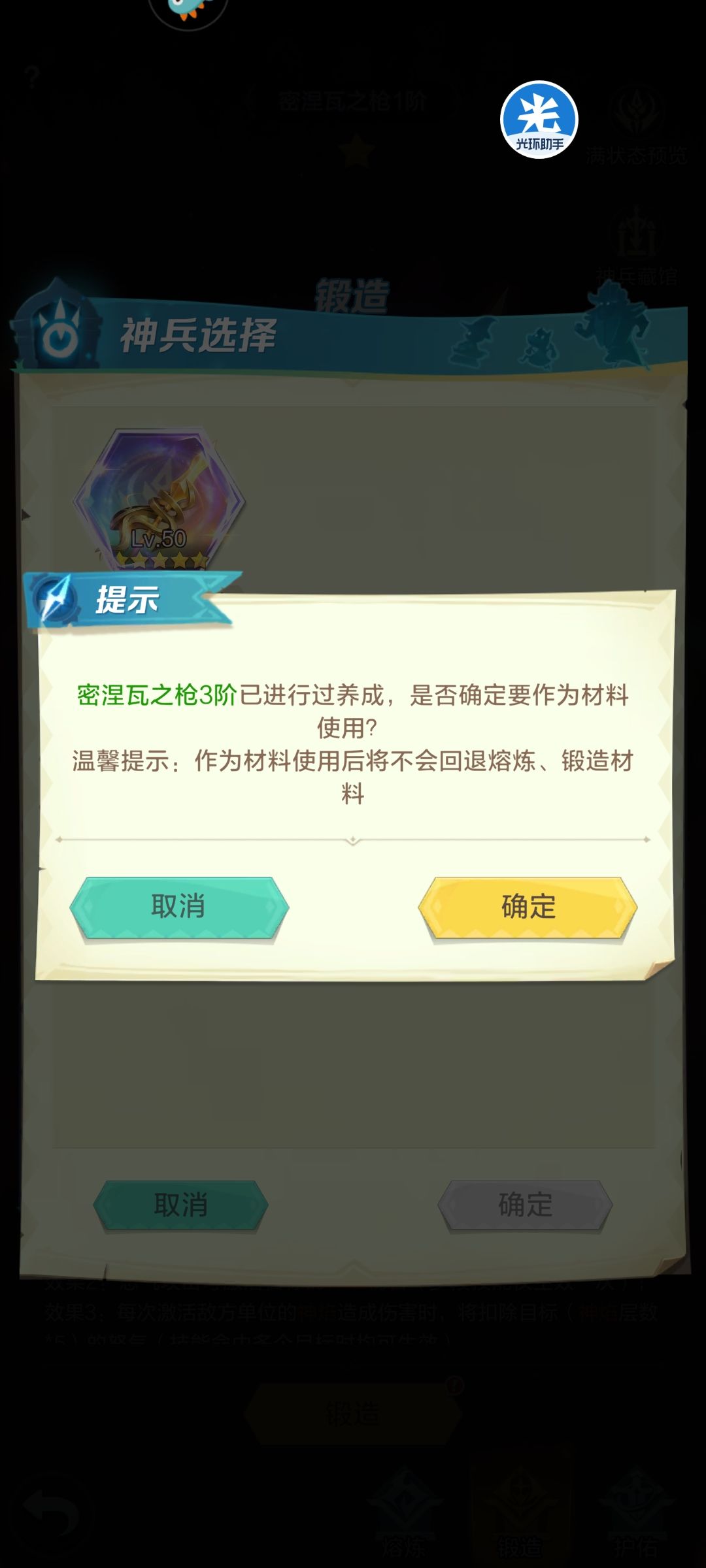 游戏身份编号:17242203107 发现这个问题很久了,以前觉得不太影响自己玩游戏,就没发。马上一大波更新就来了,其中关于神兵护佑的改动非常令人激动和向往。借着这股东风,我觉着有必要把下面这个问题也一起改动一下。话不多说,看图。 如果图片不好理解,我这里再解释一下。假如我包里有两把同样的神兵,比如密涅瓦之枪,一把是二阶,一把是白板。如果我暂时不想把白板神兵给二阶神兵升阶,而是想把白板神兵当做护佑