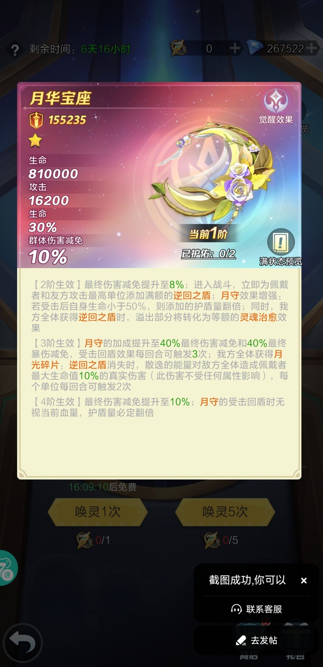 这次的新神兵白板属性应该是近段时间以来最良心的了:1阶有全体buff加成,重点是拥有逆回盾就拥有了30%最终伤害减免和减免暴击伤害减免。自己测试了一下,原来对面女娲之前能把我方打出一两个冰封,现在战斗结束,我方的逆回盾还在。(对方没有嫦娥神兵) 2阶开局满额逆回盾,溢出的部分化为灵魂治愈。也是不小的加强。小氪党充12和68那一档应该就能2阶。 我猜策划的想法:这次不抽嫦娥的人,看我怎么整你们,哈哈