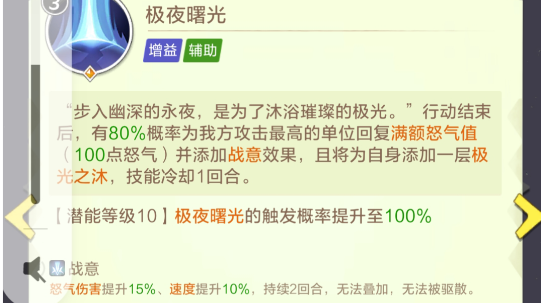 可以明显的看到第2回合行动结束后没有增加战意也没有回怒😭我的雪缘极光潜能已经开了