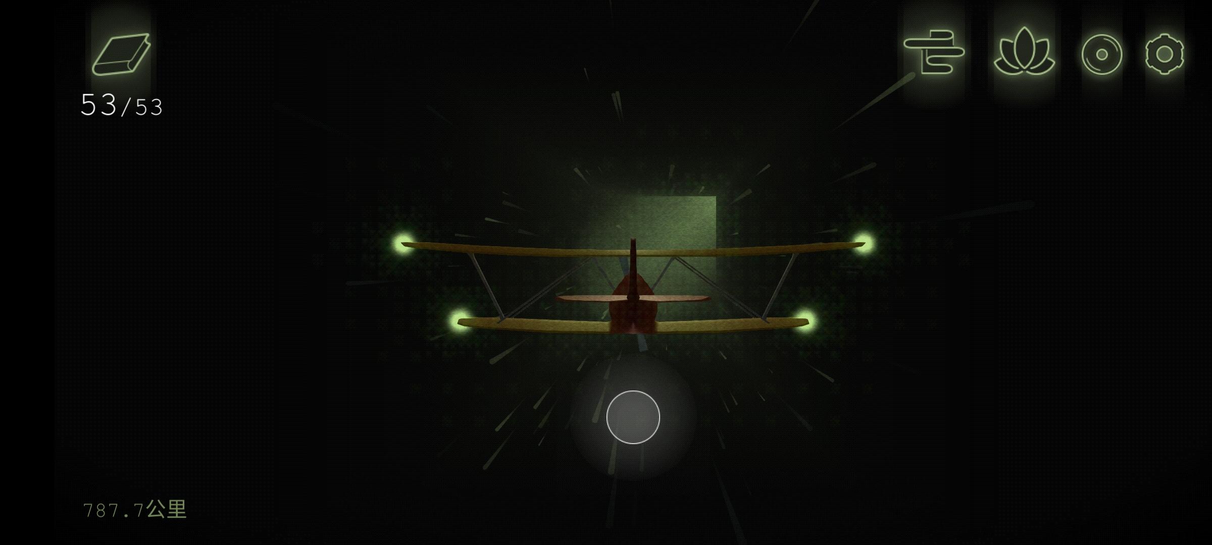 漫无目的的飞行,永远没有尽头,左下角默默统计着你飞行了多久,整个世界仿佛只有你一个人开着飞行机穿梭这一个又一个的障碍,音乐慢慢的放着,当你飞行了一段时间,你会发现,每一个障碍都和音乐相互呼应,没错,障碍的设置就是这款游戏的一个特色,完全随机,障碍随着音乐的节拍生成,加深玩家的共鸣。