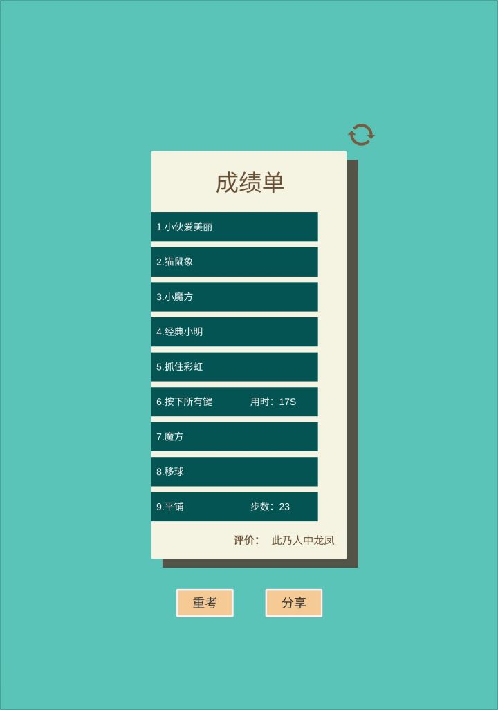 这一关我没见过类似的,但好像很熟悉,不知道是我忘了还是怎么回事。九个方块,不过不找到一不计时这个规则有点拉胯了,应该开始只能点一,这样才能算20s内找到顺序,要不然难度下降百分之八十。是考验人反应速度,记忆力,逻辑能力的关卡。