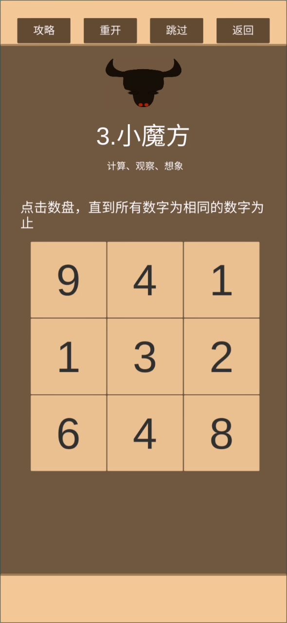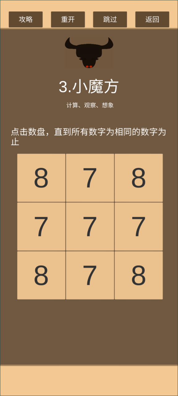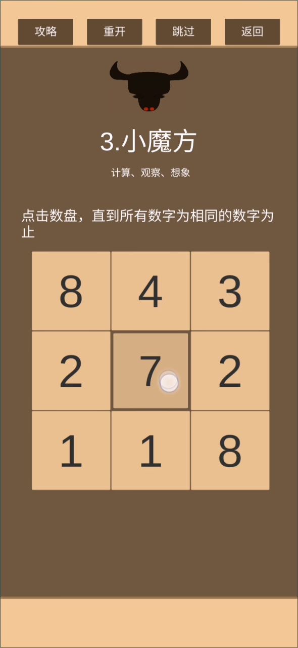 继前一个由角到边的傻瓜式解法,衍生出来的解法。这次是7个格子变化1次,2个格子变化两次。最后会剩下中间一个格子与其他的不同,反复点击四角的格子,直至边与中心相同。后面的就不用说了。 祝大家游戏愉快