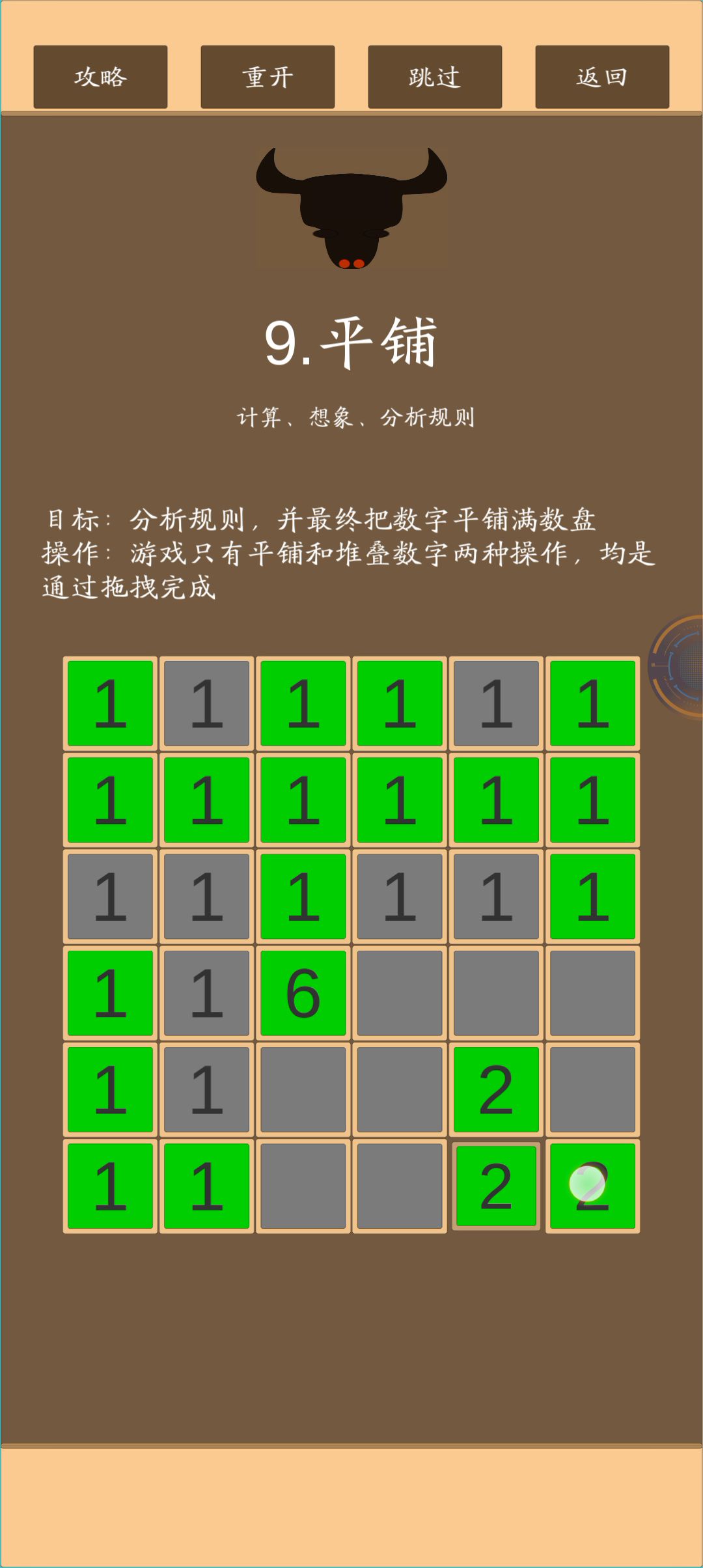 方法以及原理讲解在最下边 这边先放代码 Python刚学不久 献丑了 (视频是纯手工操作 非代码) 如果是用Python解 我的代码如下: def pd(): for p in range(1 ,10): if sl[p] == 10: sl[p] = 1 def j_1(): sl[1] += 1 sl[2] += 1 sl[4] += 1 ls[0] += 1 pd() def j_2(): sl[1] += 1 sl[2] += 1 sl[3] += 1 sl[5] += 1 ls[1] += 1 pd() def j_3(): sl[2] += 1 sl[3] += 1 sl[6] += 1 ls[2] += 1 pd() def j_4(): sl[1] += 1 sl[4] += 1 sl[5] += 1 sl[7] += 1 ls[3] += 1 pd() def j_5(): sl[2] += 1 sl[4] += 1 sl[5] += 1 sl[6] += 1 sl[8] += 1 ls[4] += 1 pd() def j_6(): sl[3] += 1 sl[5] += 1 sl[6] += 1 sl[9] += 1 ls[5] += 1 pd() def j_7(): sl[4] += 1 sl[7] += 1 sl[8] += 1 ls[6] += 1 pd() def j_8(): sl[5] += 1 sl[7] += 1 sl[8] += 1 sl[9] += 1 ls[7] += 1 pd() def j_9(): sl[6] += 1 sl[8] += 1 sl[9] += 1 ls[8] += 1 pd() sl = [0] ls = [0, 0, 0, 0, 0, 0, 0, 0, 0] while True: for i in range(9): sl.append(eval(input('一到第九格逐个输入 每输入一格按一次回车'))) if sl[-1] not in list(range(1, 10)): sl = [0] print("输入错误,请重新输入") break else: break while sl[1] != sl[2]: j_3() while sl[1] != sl[4]: j_7() while sl[2] != sl[3]: j_6() while sl[4] != sl[7]: j_8() while sl[6] != sl[8]: j_2() j_7() while sl[6] != sl[1]: j_9() while sl[1] != sl[9]: j_1() j_6() j_8() if sl[1] != sl[5]: v_1 = sl[1] v_2 = sl[5] cou = 0 while True: v_1 += 3 v_2 += 4 cou += 1 if v_1 % 9 == v_2 % 9: break for j in range(9): if j == 4: continue else: ls[j] += cou for l in range(9): ls[l] %= 9 print(ls) #输出结果有9个数字 从第一到第九分别代表对应的每格需要按下的次数 按完即通关 方法如下: 第一步:九宫格任意一个角都可以 我这边是选择了左上角 如视频 我先让左上角三格按照第一格的数字调整(也可以是任意数字 看你喜欢) 第二步:让右上角和左下角的数字与第一步调整的数字(即第一格数字,后面我都会管他们叫第一格)一致 第三步:一次第二格和一次第七格为一组 一次按一组 按到第八格与第六格一致 (当然 三四为一组也行) 第四步:按第九格 按到第六格和第一格一致 第五步:(一次第一格 + 一次第六格 + 一次第八格)为一组 按到第一格与第九格一致 最后一步:此时外围8格数字是相同的(运气好九格都相同 那就可以省略这一步直接过关) 外围8格各按一次为一组 按到通关为止 原理: 如第三步 第二第七为一组可使之前调整出的数字各个相同 又能以1为单位向上调整第八格 使其与第六格一致 再通过第四步 以1为单位同步调整第六第八格 使他们跟上大部队 现在就剩第五和第九两个孤儿 第五步原理:一组(一次第一格 + 一次第六格 + 一次第八格)可以做到除五和九外的所有格以1为单位向上调整以及第九格以2为单位向上调整 两方调整的单位相差1 所以若干组之后 外围8格一定能一致 最后一步原理: 外围8格各按一次可以使外围8格以3为单位向上调整以及第五格以4为单位向上调整 两方调整的单位差还是1 所以若干组之后 9格一定能一致 以上组数也一定不会超过8次 我的这一套方法做下来 核心就在于调整的单位差 或许有些格子需要按的次数超过了9次 很明显 9次一循环 所以以上方法或许得做很多不必要的事 最简的方法一定是每格按的次数皆不超过8次 但方法就是这样 要一步一步来 这一关我也只研究到这 毕竟再研究别的方法我还得重新构思代码 我暂时没别的办法 不过这一步在Python代码中可以做到尽量省 即 每一格次数除以9 得到的余数为最简方法