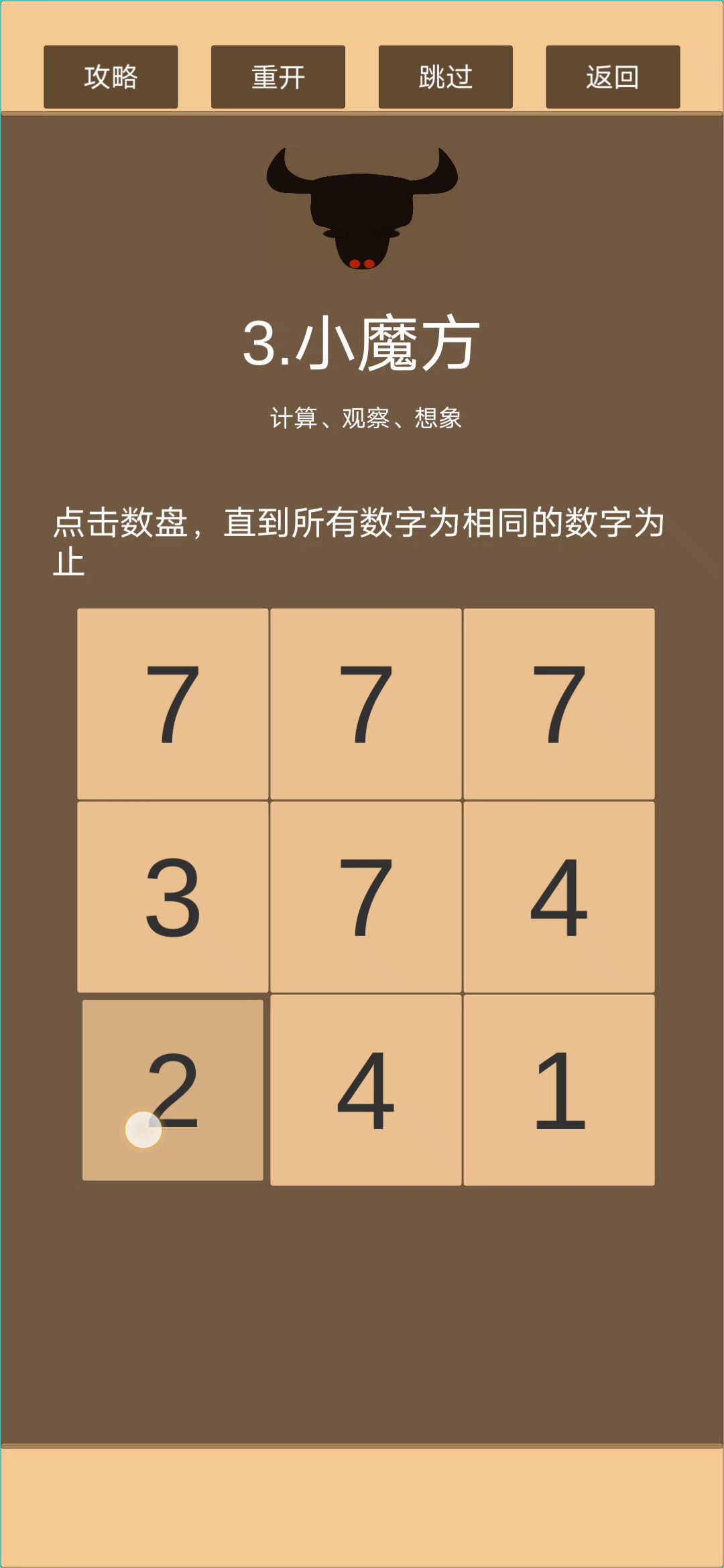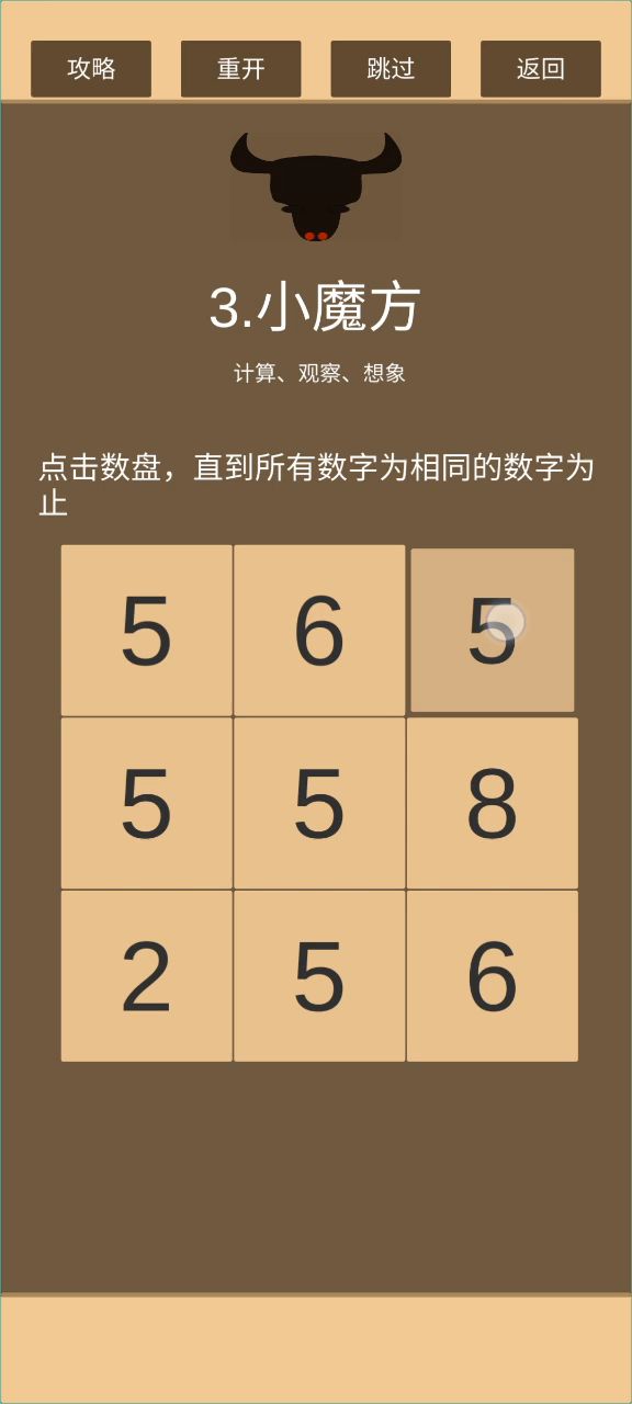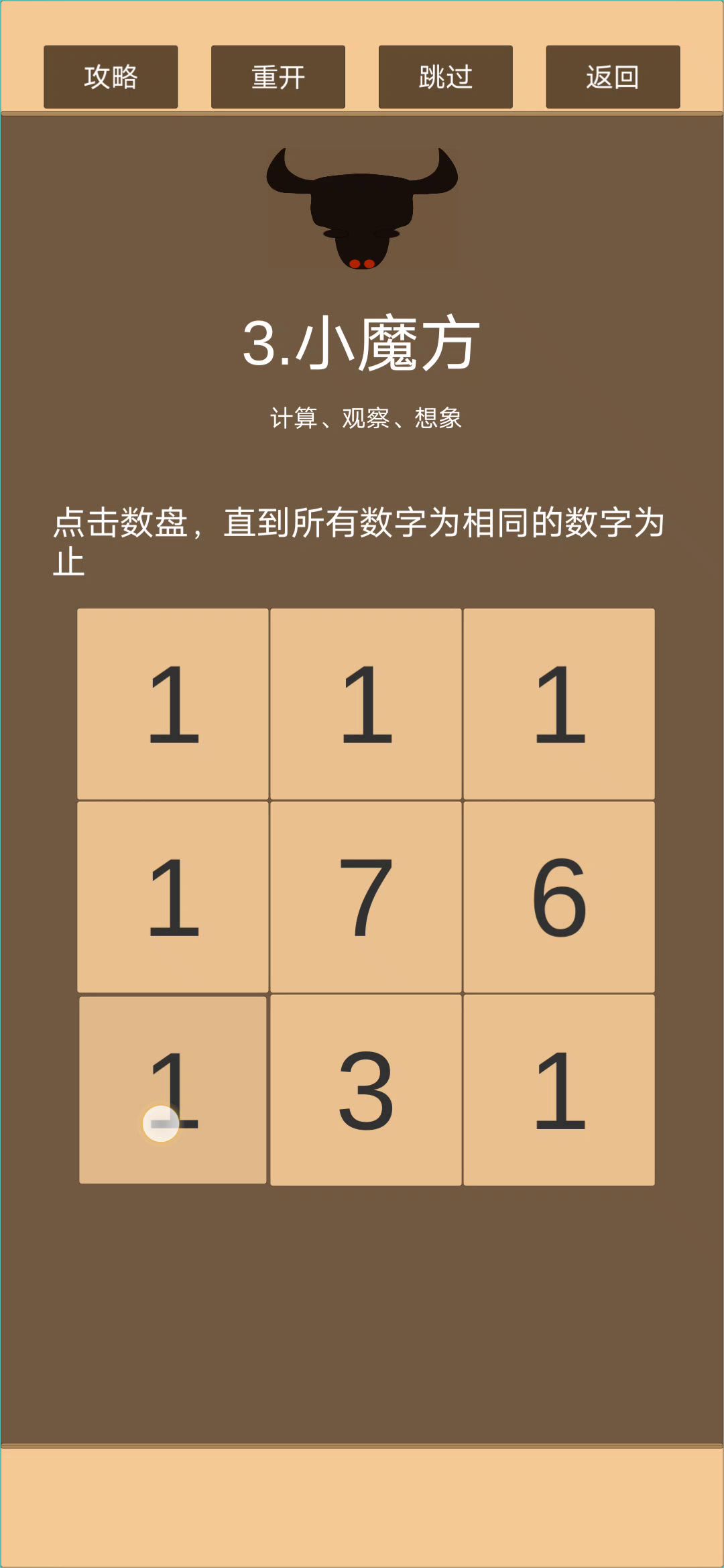 应该算是第三关最简单的方法了 前面两步都是不用脑子的 先点中3行使第一行统一 再操作第三行使第二行与第一行一致 然后点一六格使上6格与第七格一致 再点三四格使除第八格以外的数字相同 再点二七九格通关