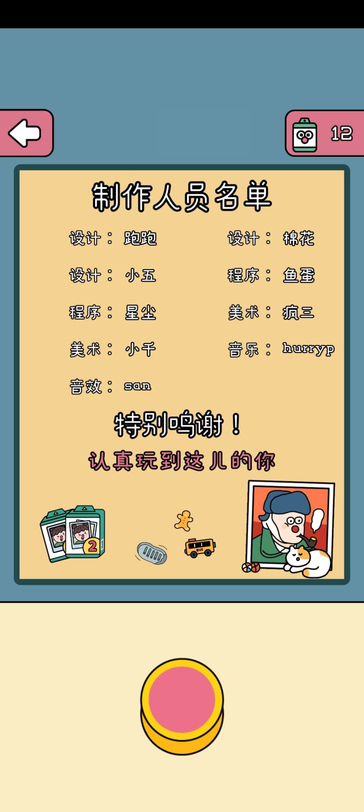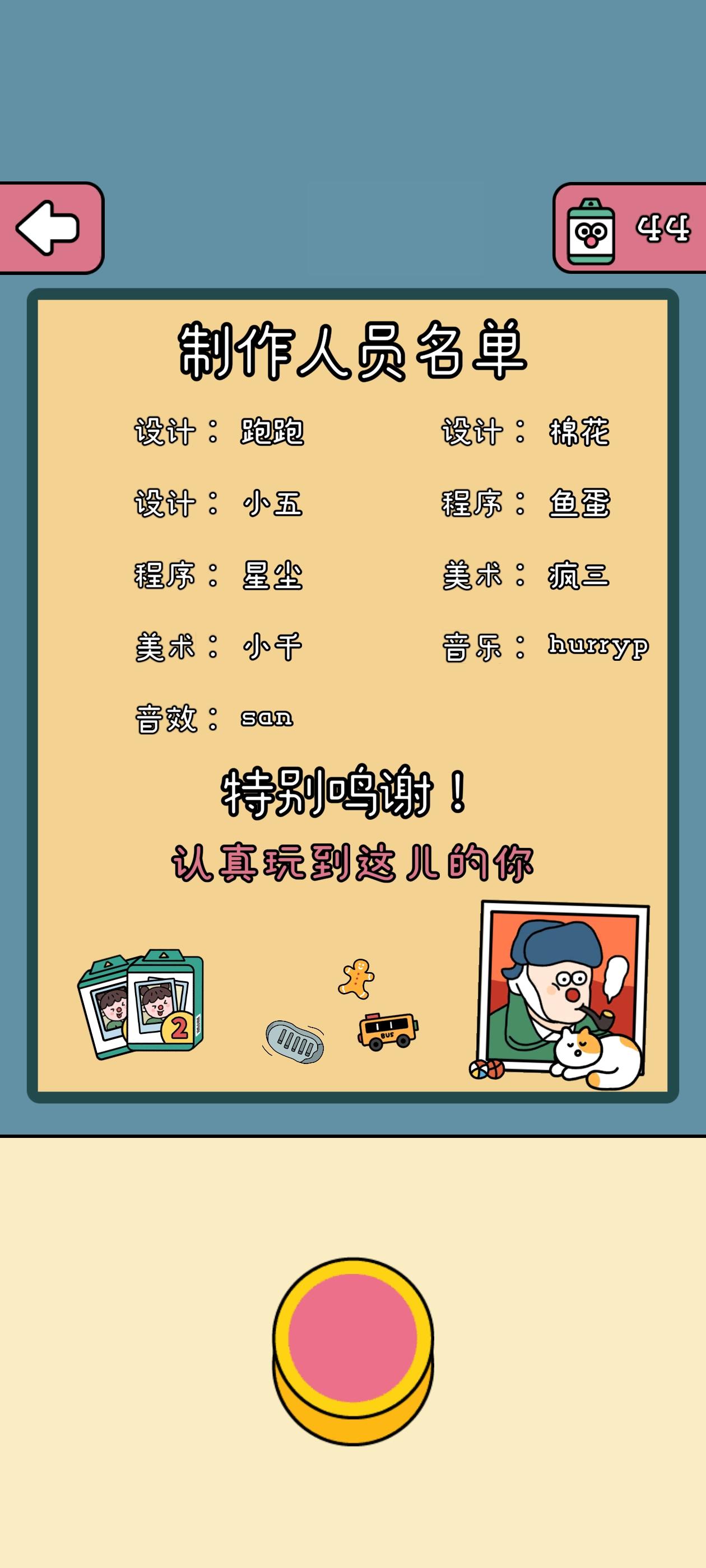 4.游戏并没有其他的模式和内容,成功通关一百关之后,会有个找物品的游戏,做完之后就到了制作人员名单界面。