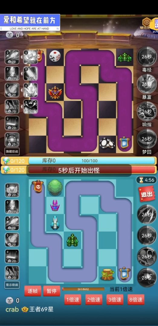 视频一 视频二 这里分了视频一和视频二进行说明,让大家更好的去理解游戏规则。 游戏玩法里说明2条:消灭己方一个怪物将增加对方库存2个怪物。 3条:库存的怪物将陆续进入战场,超过50库存时会消耗5个怪物产生boss。 上述两条规则都提到库存,我们可以在对战界面中查看到,以下是入场怪物和库存怪物的数量信息。 左边数字是入场怪物数量。库存右侧数字就是库存怪物量。如图片中14/120,上方选手入场怪物是