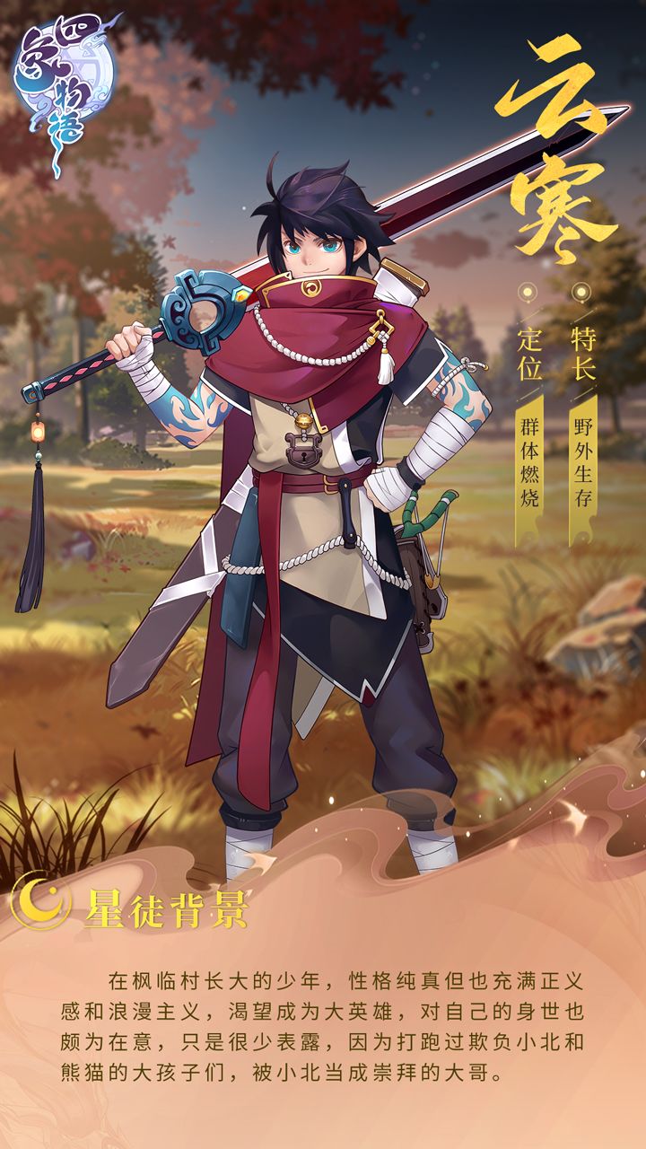 “我可是要超越星主的男人!哈哈哈”——云寒在枫临村长大的少年,性格纯真但也充满正义感和浪漫主义,渴望成为大英雄,对自己的身世也颇为在意,只是很少表露,因为打跑过欺负小北和熊猫的大孩子们,被小北当成崇拜的大哥。阵营:白虎性格/定位:热血少年/群体燃烧喜欢/讨厌:大侠事迹/恃强凌弱者☞四象星徒传合集请看这里——————————◑◑◐◐———————————☞《四象物语》现已开启预约T