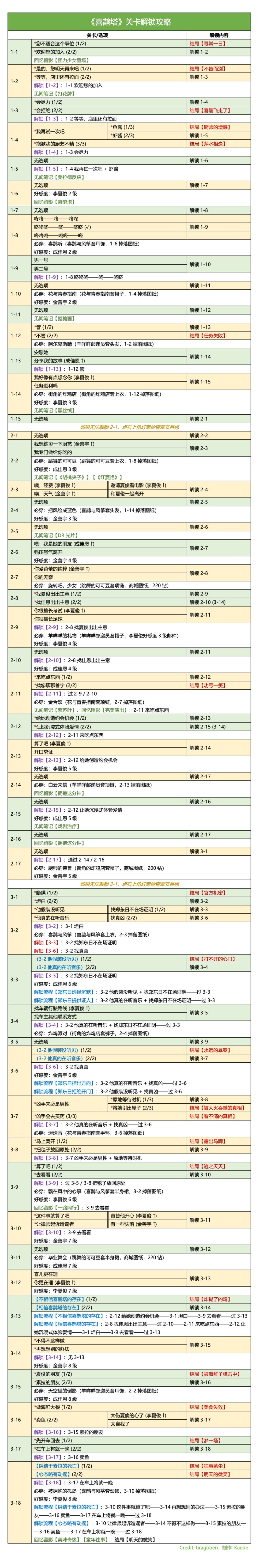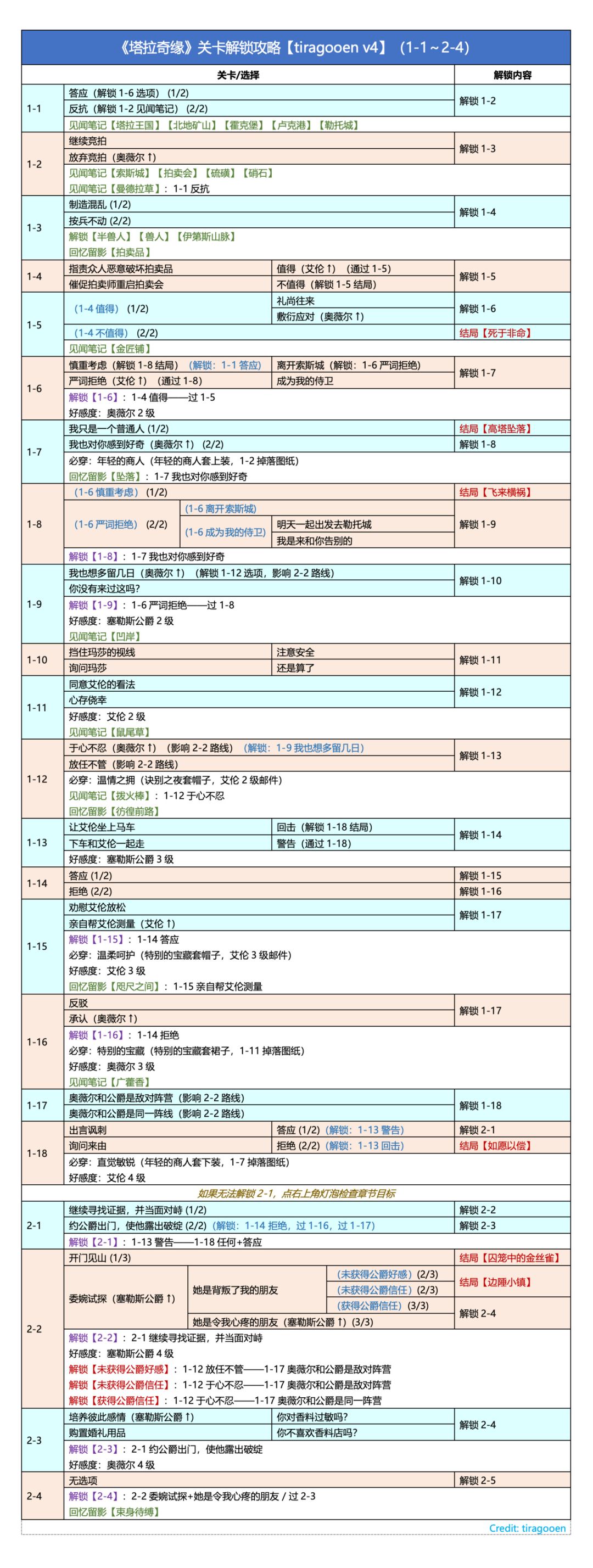 🍀《塔拉奇缘》关卡解锁攻略【tiragooen版】 / 必做 / 见闻 / 留影 好感度:艾伦7级(五星信物)、奥薇尔7级、塞勒斯公爵7级 这本书分支多,tira版在许多地方都有不同,很值得参考(还不行的话取个交集)
