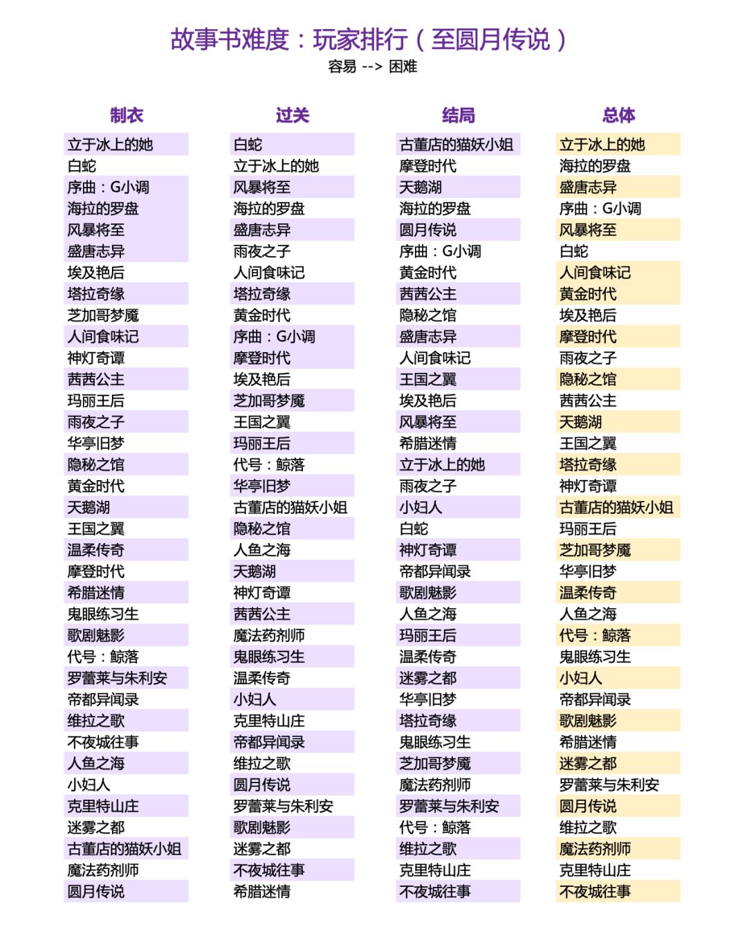 【故事书难度排行(玩家主观打分)】 开书参考。 不过难度也不是唯一标尺,不夜城难度天花板,故事也天花板呢。 来自红迪玩家主观打分,截至《圆月传说》, 参考日期23/4/30。