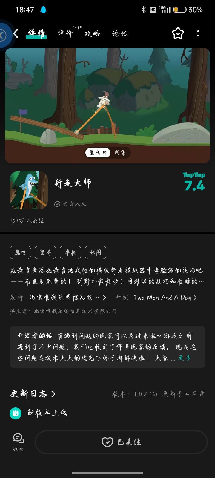 游戏画风搞怪可爱,支持横屏竖屏切换。你需要操作各种人物(小动物、香肠、外星人还有一些奇形怪状的生物)踩着高跷走路,通过路上遇到各种奇形怪状的阻碍(猪撞树上了,你撞猪上了)到达终点,小时候看到庙会上踩高跷表演,就非常羡慕高跷上的人,结果自己体验起来就会知道高跷是那么难控制和掌握了。