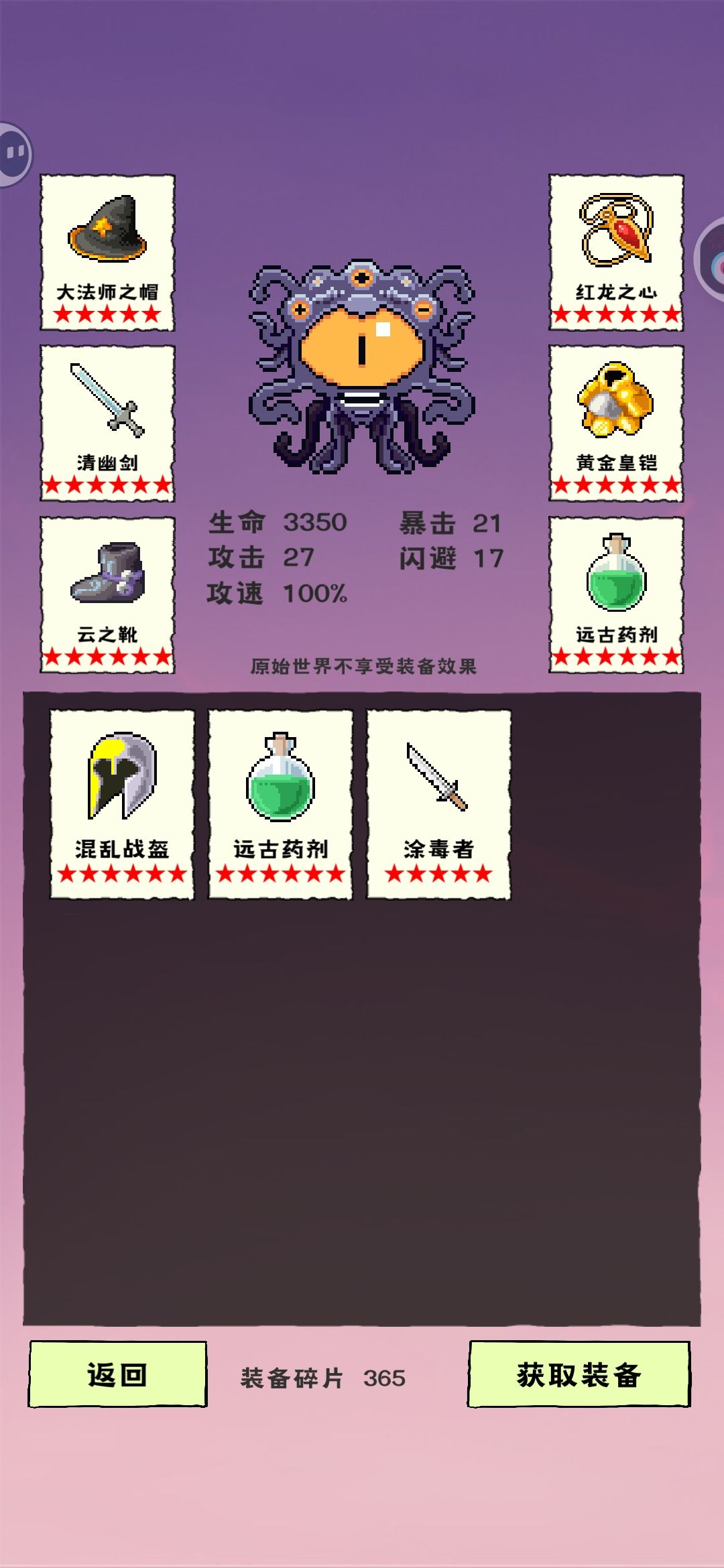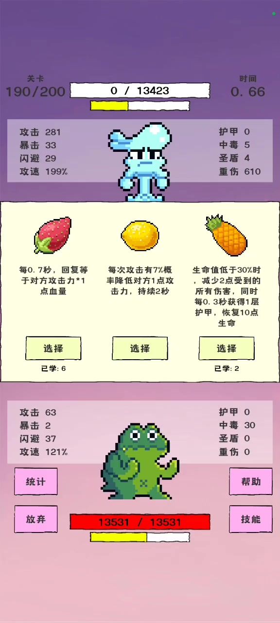 首先我玩了大概9个小时,上论坛才知道还有装备系统(坑爹)。 我用的人物是蛇,两次就通关破碎世界! 思路如下:暴击秒杀流,技能选择1攻加8血,400血加1攻,0.5秒加暴击,0.5秒加闪避,1秒1攻,回血加攻,连击和先手30闪避攻速必要,加生命百分比和百分之15回血必选,暴击回血暴击加攻,刷出百分之30吸血之后只要暴击攻击类,打第200关数据大概堆到2万五以上血,接近300的攻击,180攻速,150