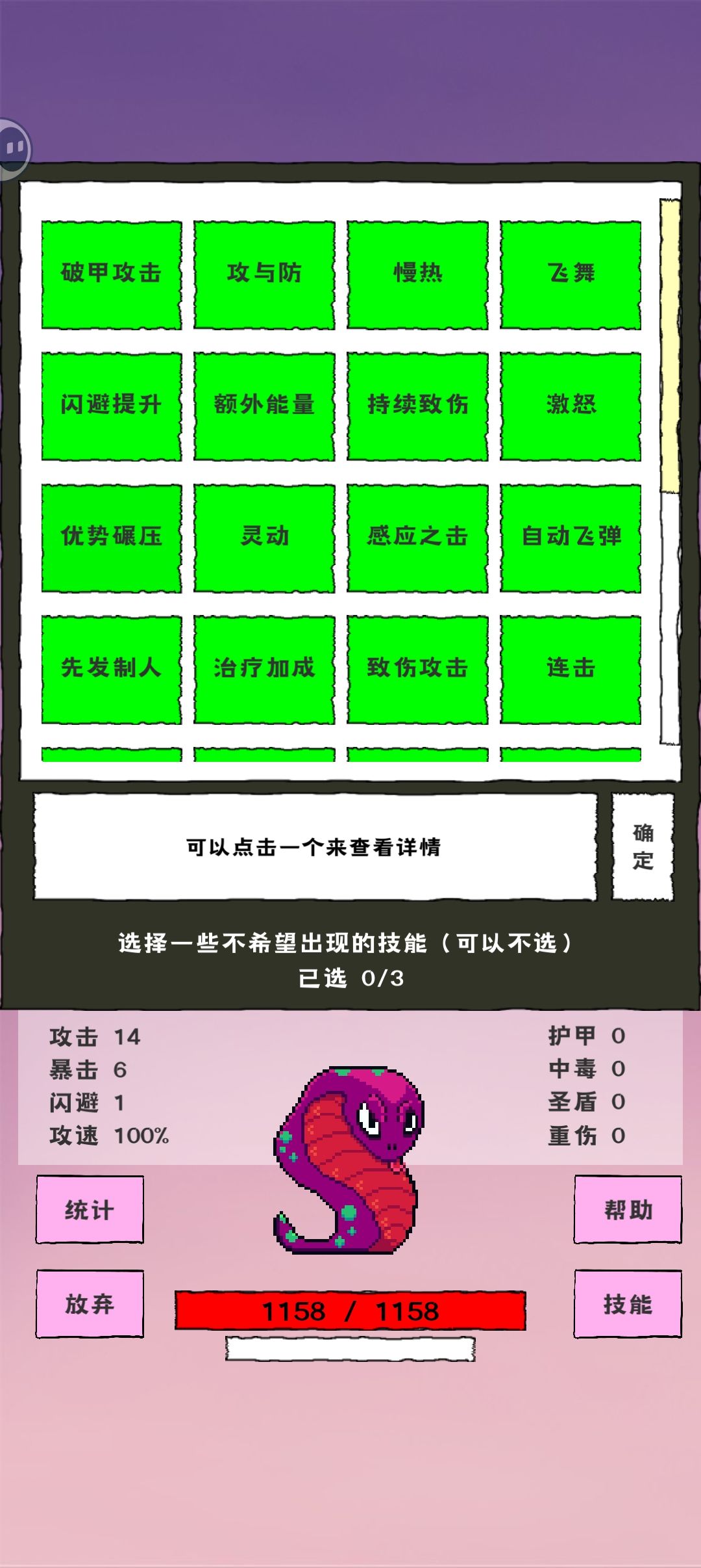 打了2天终于通关了,走了很多弯路,这里简单的总结一下,给后来者一些建议。先贴一个通关图☞ 第一:有钱就依次训练闪避、血量、攻击、暴击,不要买角色,角色差别不大,浪费钱! 第二:技能只选回血技能和闪避技能,任何加闪避的都不要放过。输出不要加攻击和暴击,切记切记!特别是第十一世界的BOSS,你攻击越高暴击越高攻速越快你死的越快,因为这弟弟浑身都是反骨(反弹伤害)过不去是因为你被自己的攻击秒杀了 第三: