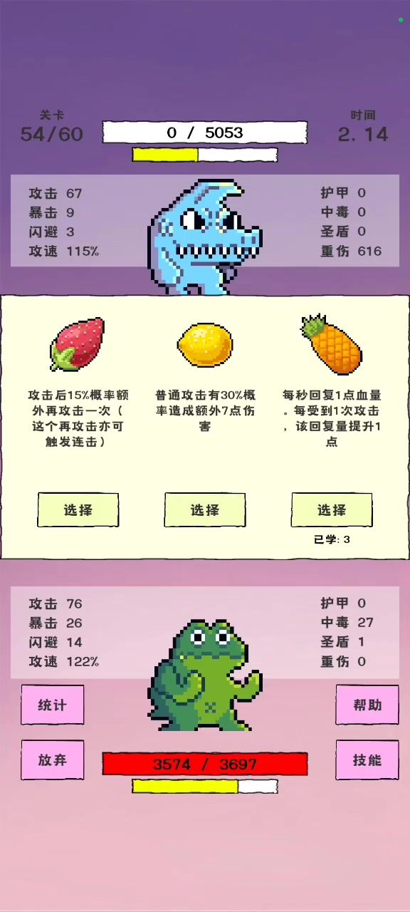 至于不看广告不训练初始角色通关就留给后人吧,这太难了,选成长技能可能第一个小怪都打不过,不选的话后面小boss又打不过