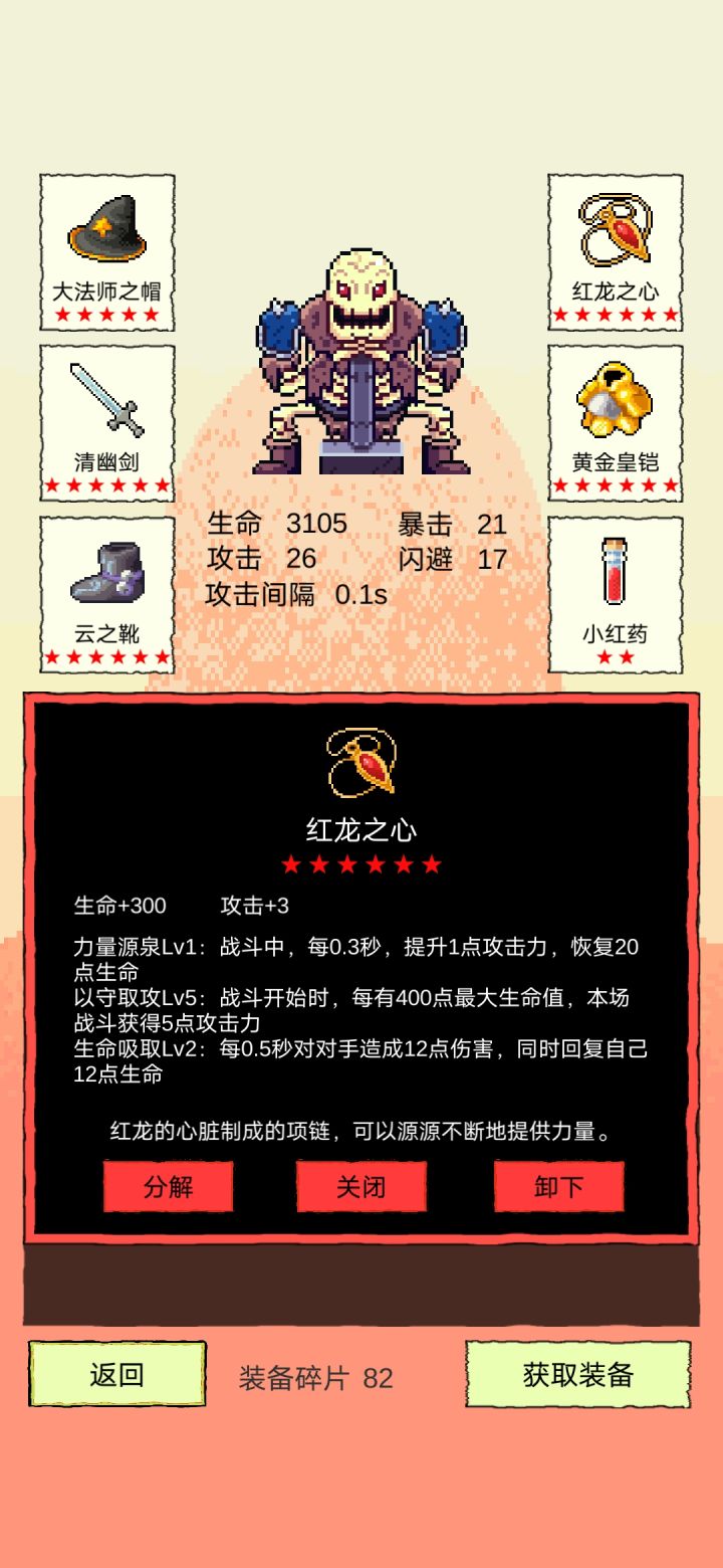 很简洁的小游戏,感觉还挺解压,抽到刁装备的感觉很爽。希望还能更新😋,🈶超过两百关的模式就好了。