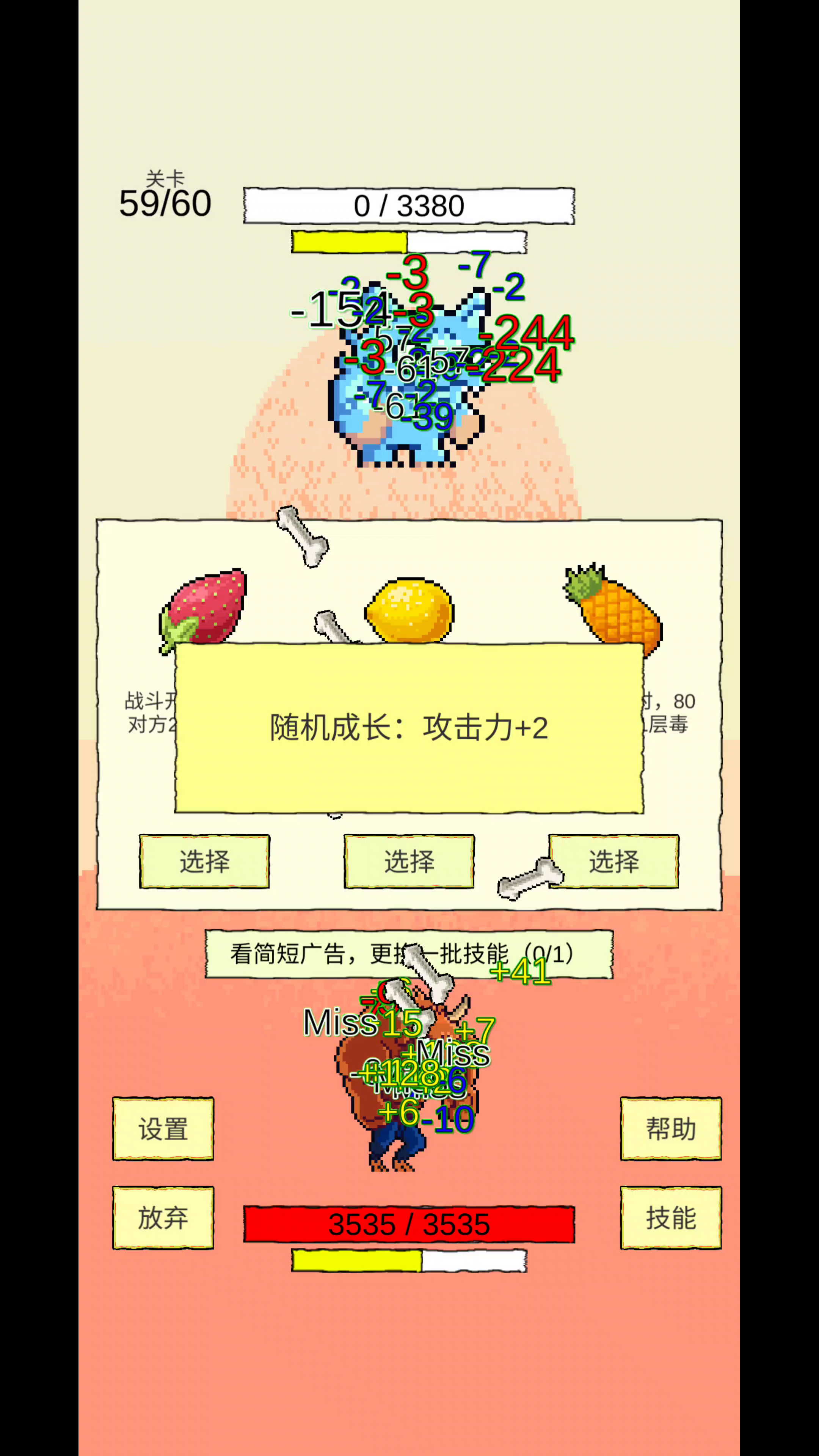 BUG来啦!省时省力省手(手动滑稽)! 可以刷角色 可以刷金币 可以挂机玩 BUG的发现过程:本来是打算快点点选择的技能,结果发现关卡数目不对劲,然后再次快速点了一下,发现关卡从8跳到了10!所以………嘿嘿嘿 注:早点用,下次估计会修复!