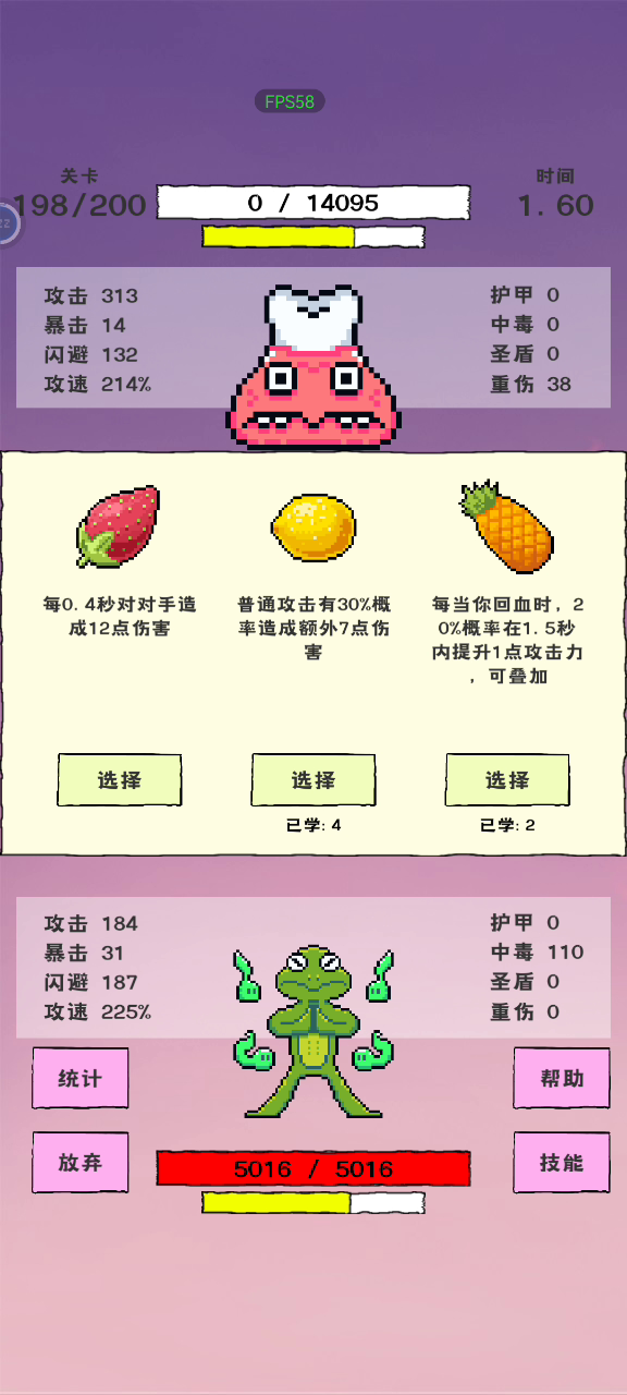 一开始都是想着要么短攻快,要么稳老狗。但在最后那个老登面前你就像个新兵蛋子,你秒不了他,你先被复仇死了。你想回复各种buff,击败加成,对不起,重伤不让你回复,一下回到解放前,根本拖不住,对面也是回复反伤,除非你狗屎运。那么,怎么过呢,你看对面的输出,普攻为主,复仇和重伤回复,所以1受伤在1.5秒提升闪避,点4级,还有别的闪避技能,堆到99对手打不到你,就解决普攻,和大部分重伤2回复,需要