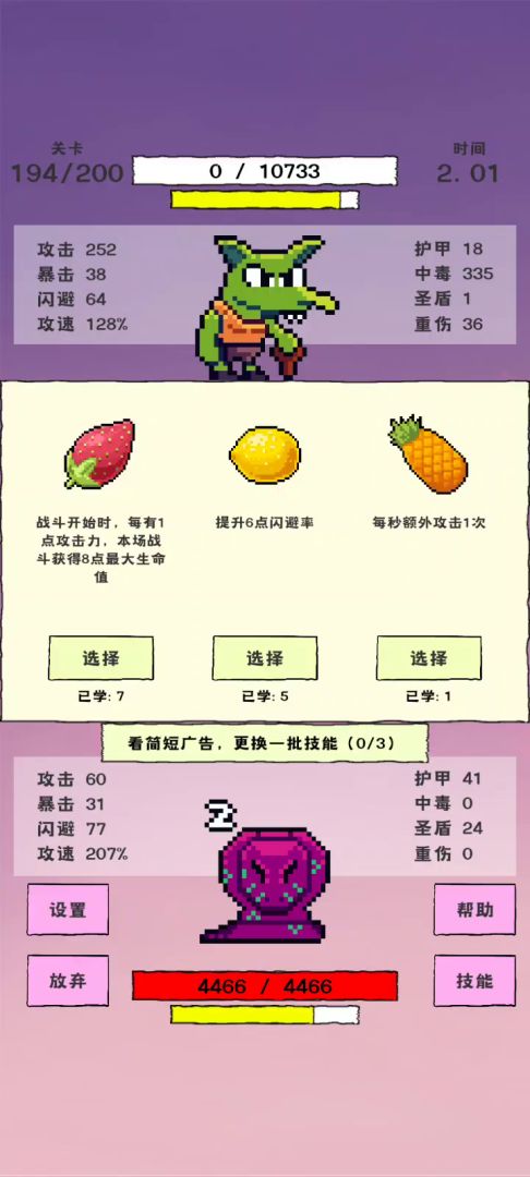 至于不看广告不训练初始角色通关就留给后人吧,这太难了,选成长技能可能第一个小怪都打不过,不选的话后面小boss又打不过
