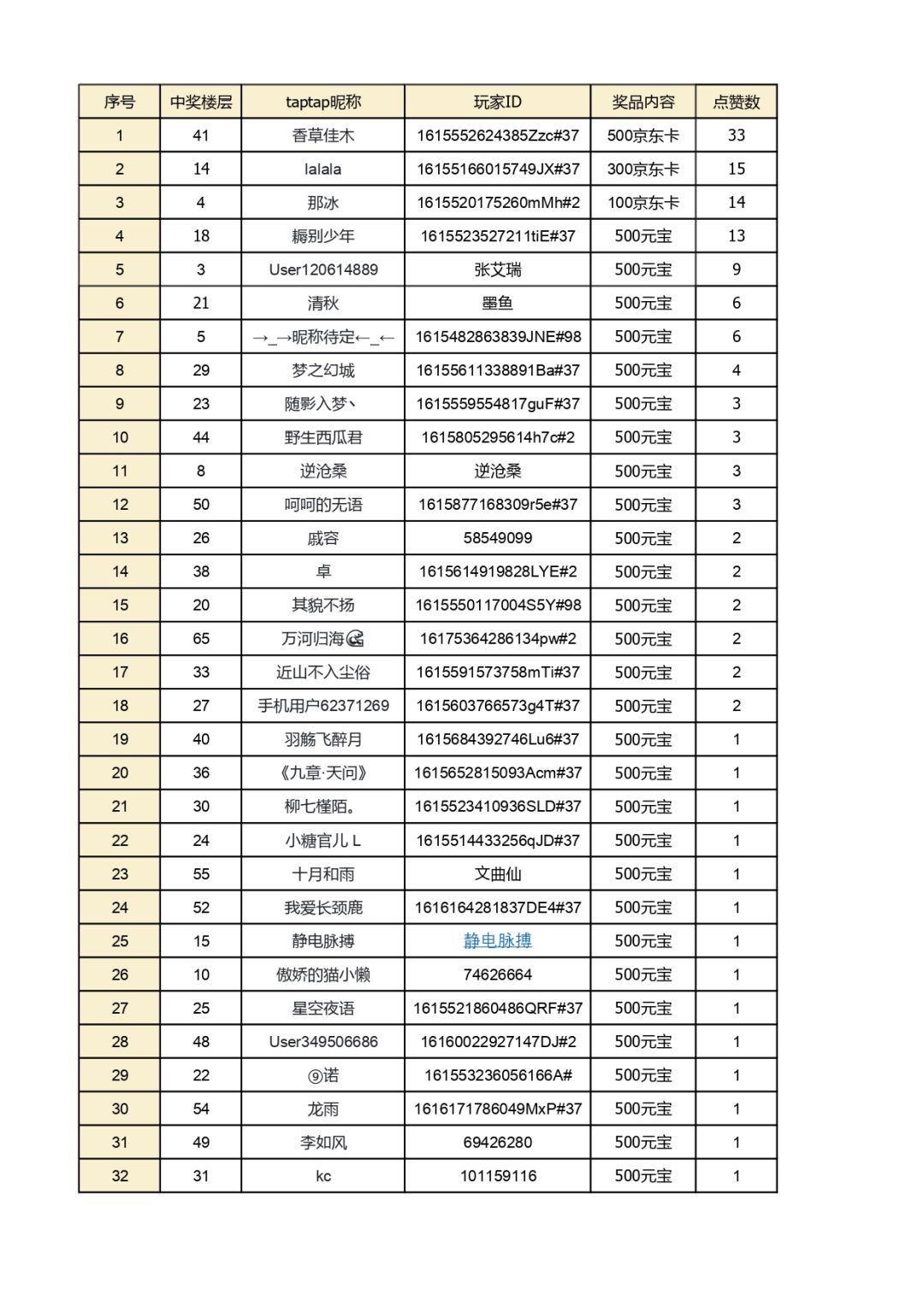 原帖链接: 获奖的院长请添加官方QQ群:838206379(一群),894516435(二群)或759218276(三群),并联系前缀为【书院管理处】的管理员,提供中奖楼层回复截图与游戏内ID截图领取礼包~ 管理员核实后,会尽快发放奖励~ 再次感谢各位院长对《古代书院模拟器》的大力支持! 获奖名单: 没有获奖的院长也请不要气馁,新一周的福利活动已经来啦~ 传送门:https://www.tapta