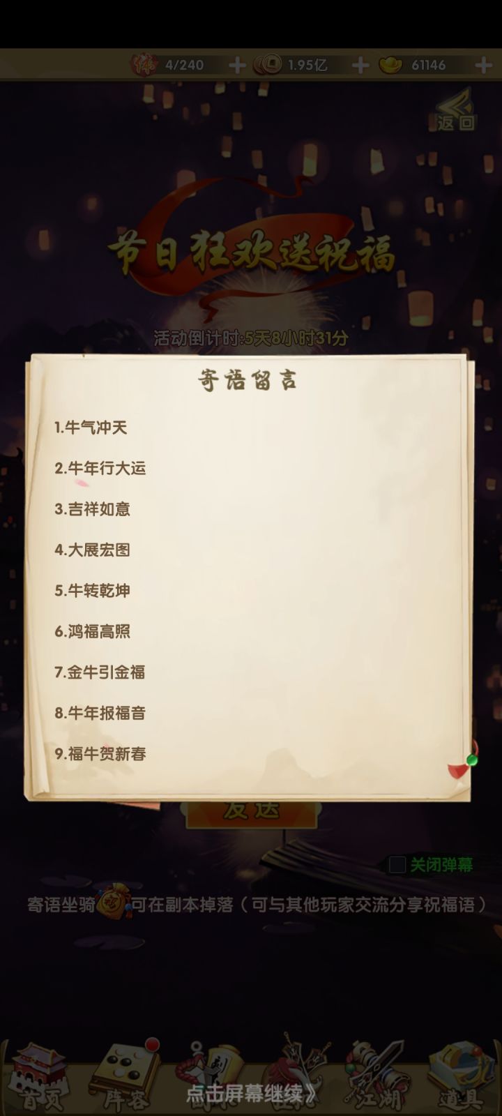 快到春节了,在此提前为各位少侠送上祝福,本次为限时的江湖密令呦,少侠快来领取吧!本期江湖密令:6820bf51a3 使用期限:即刻~2021.1.31礼包码使用方式:进入游戏,点击上方活动按钮,选择礼包码,输入即可获得相应奖励。本条回复超过10人再追加一条江湖密令呦!再次感谢各位的支持~咱们下期再会!