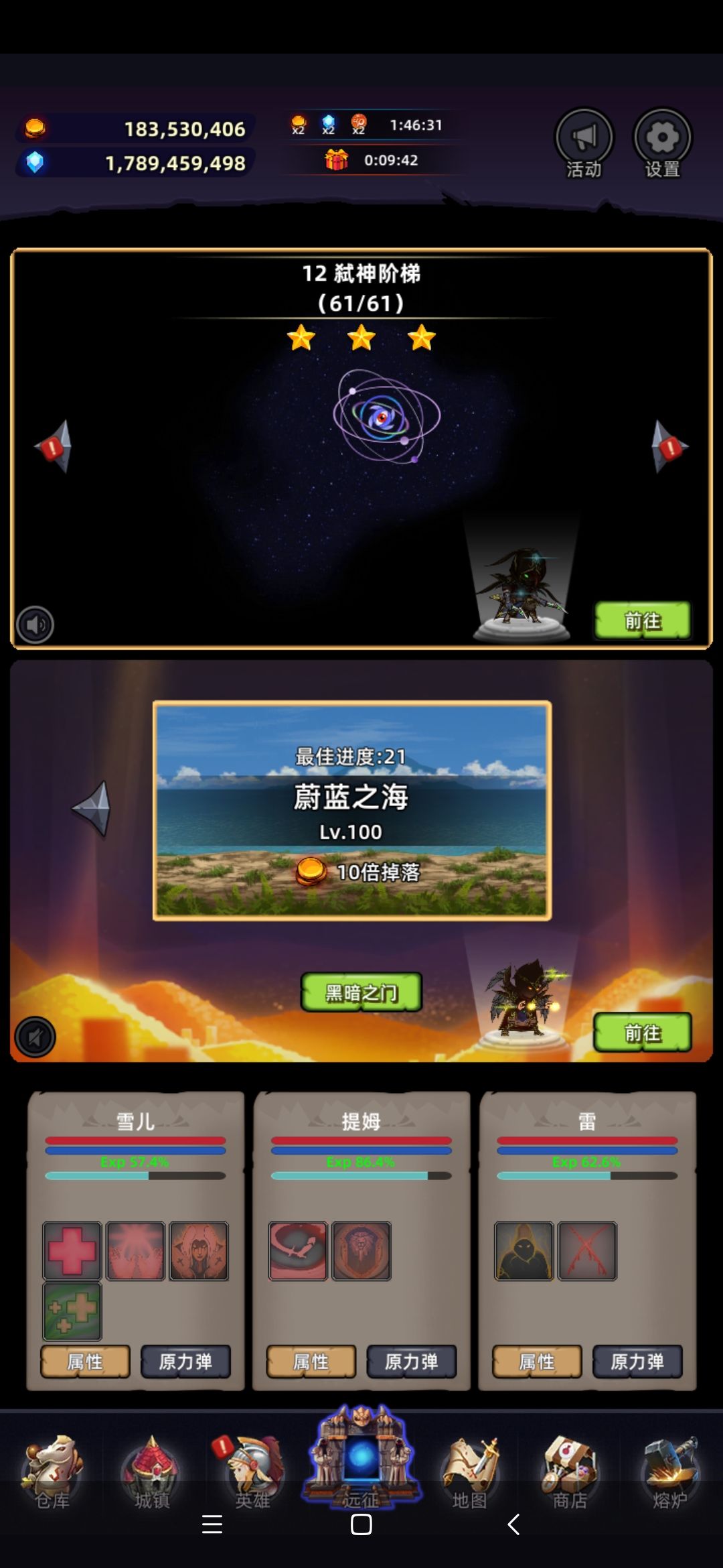 很良心的一款放置休闲游戏,里面的人物模型是贪婪洞穴的造型,个人也比较喜欢这种地下城的风格造型,下面说下玩了两天的感受。40多小时打到了弑神阶梯,应该是90级就可以过的本,睡了一觉起来92级了。后期的没有玩,说一下前期的。 三个职业战士 刺客 牧师,不需要法师的情况下打到是弑神阶梯。 前面升级很快,直接挂机托管,然后拍卖行三个小时刷新一次,主要是拍卖行的刷新经验,运气好的话很快升级到60,有可能还会
