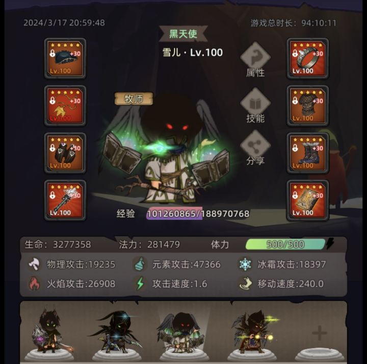 群里天天有新人在问,决定写一篇攻略,鱼乐大佬的攻略挺好的,但是针对现版本有挺多变化,根据本攻略你可以很轻松玩穿这游戏!附图是我的毕业属性,图5很重要!首先除了经验值和金钥匙,其他不需要看广告,前期钻石金币给太少,银钥匙没用,为了经验3次拍卖必刷,时间少的话等自动刷新以后再手动,不然会重置时间。属性值:战士前期全力量,后期全敏捷宝石+敏捷点到9.05攻速,其余全力。刺客,宝石加点全敏。牧师,宝