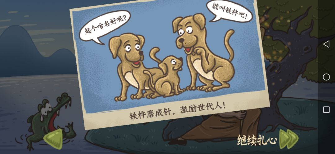 点小孩,奶奶在喊铁杵磨针时,把小黄狗移到奶奶手里(要是不及时,婆婆会敲碎大石。 其他路线✗: -点鳄鱼,婆婆会把铁棍扔鳄鱼嘴里。 -点婆婆,婆婆会抽查小孩知识,敲断大树。 -点小狗,小狗只会汪汪叫。