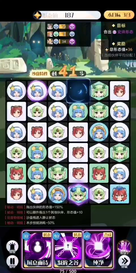 15盘 80贝 68-50 3500w 思路 —— 写在最前 终于拿下了贝 已经很久没碰梅和尼 都快变成她的形状了(划去) 68-50卡很久了 这关恶心就恶心在随机成分比其他几个英雄都高 吃运气吃落子的情况 论坛的好兄弟支的招都是烧血改动前的办法 尝试很多次没用过 今天来做自己的英雄 ———————————— ●○○【技能佩戴】○○○ 养精蓄锐 形态爆发 80蓝 下一步之前掉落所有伙伴形态值+2(