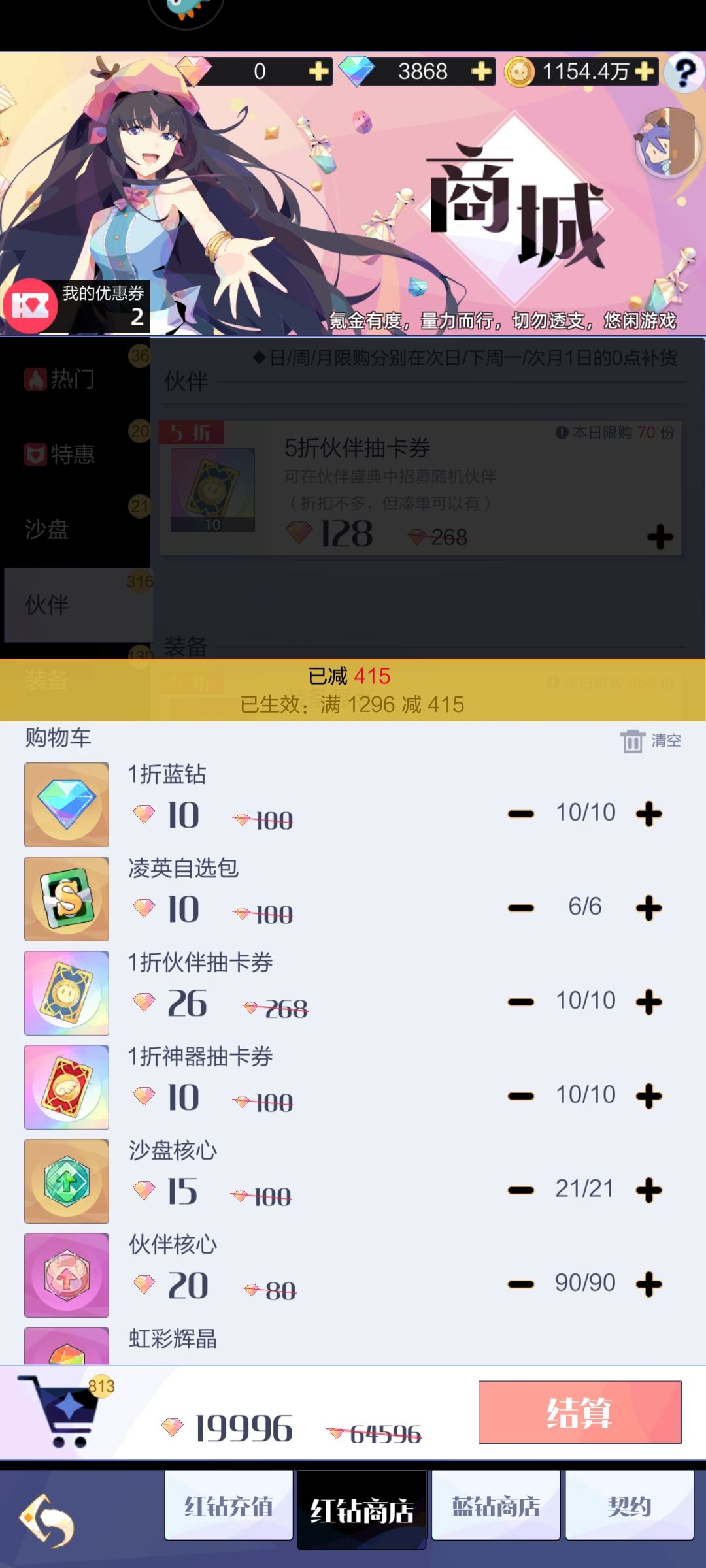 样本来源:红钻商店几乎满库存的小号,目的是保证收益最大化,对于已经买空每月限购或者每周限购的玩家来说,实际收益低于样本账号 实际收益综合:(详见图片) 蓝钻1000个*10组+30组+70组共110组 凌英自选1包*6组 伙伴抽卡卷10张*10组+30组共计40组 神器抽卡卷10张*10组+60组共计70组 沙盘核心5个*21组 伙伴核心10个*90组 装备核心10个*90组 虹彩辉晶1个*180
