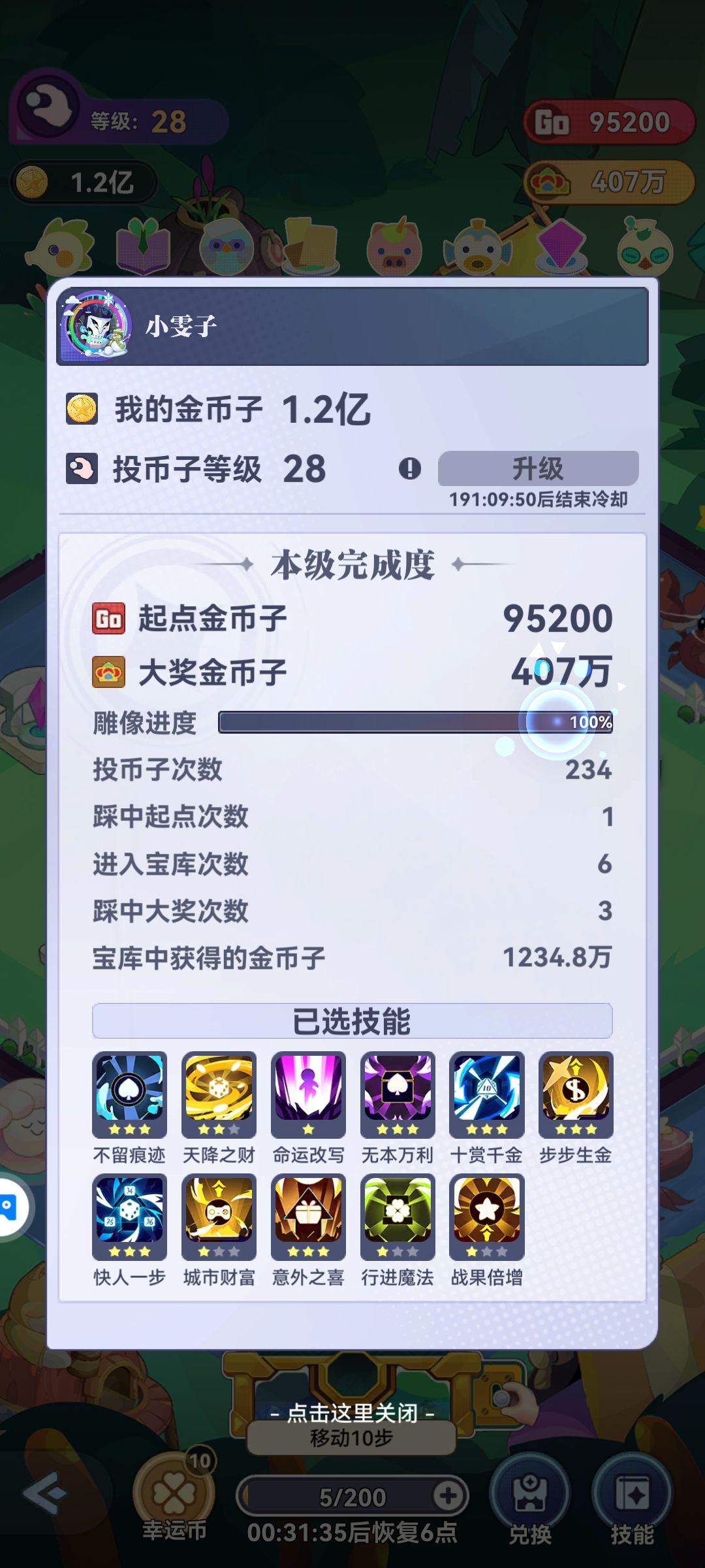 肝了几天,信息差的红利基本过去了,发个攻略让大家参考一下吧~ 首先,给出文字版全技能图鉴: (技能没拿全,有一些数值并不是百分百准) 1.投到币子堆有15/25/40概率获得幸运币 2.每次投币有10/15/20概率不消耗游戏币 3.宝库抵挡退出一次 4.投到币子堆有15/25/50概率不消耗游戏币 5.宝库结算获得大奖5/10/20百分比金币子 6.经过起点15/25/40概率获得幸运币 7.投