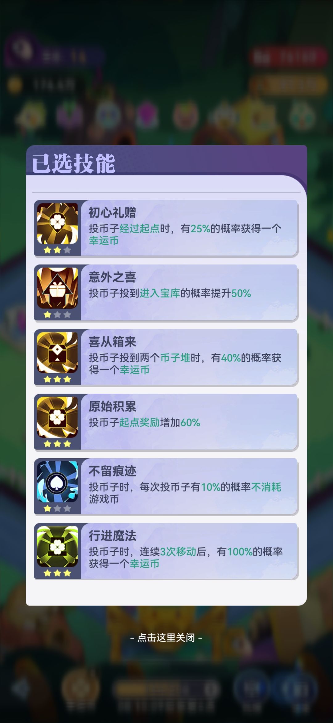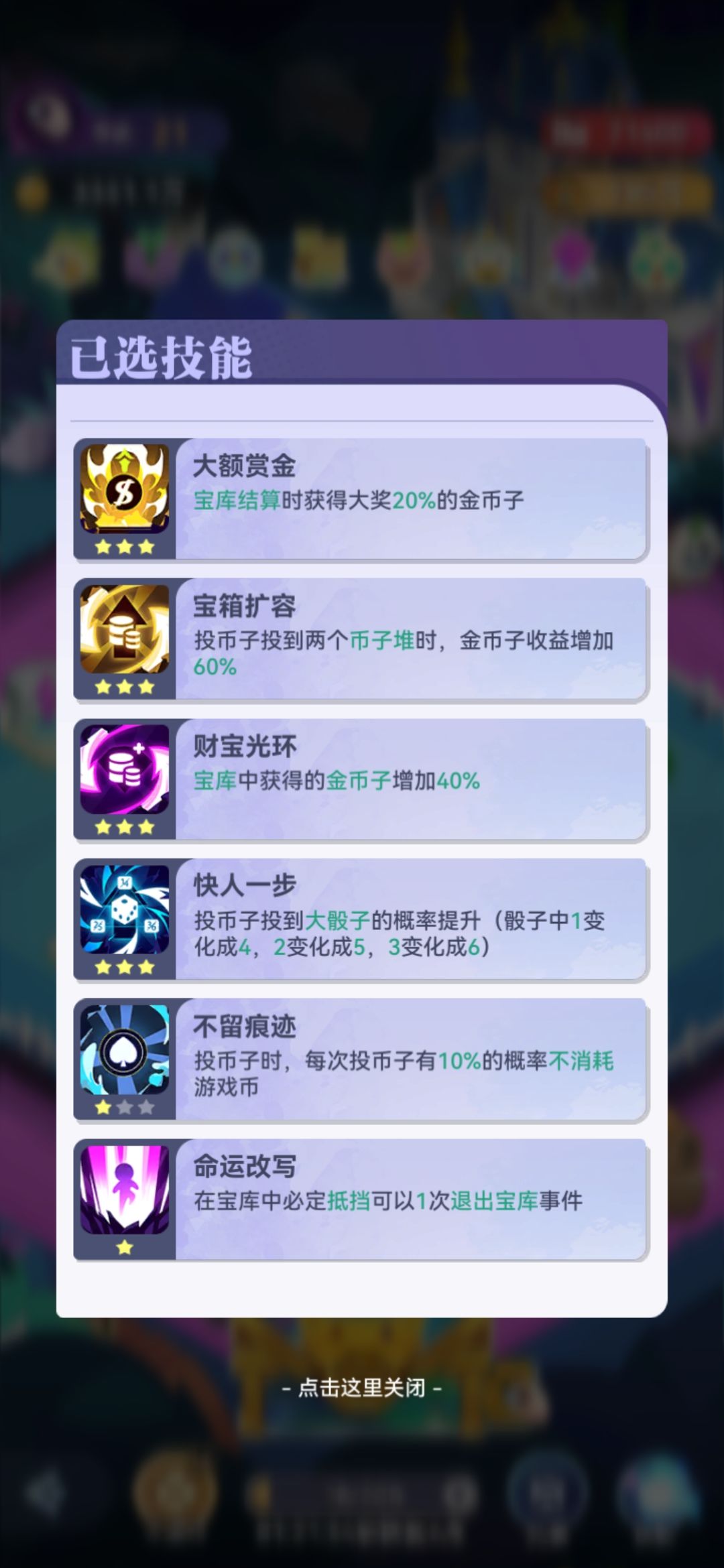 技能获取: 踩到没有开启的灰色格子 刷新三个技能 可选择一个获取 技能星级: 每个技能初始一星 每获得一次增加一星 最高三星等级 只有抵挡退出宝库 “命运改写” 技能 上限一颗星 (只会获得一次,不可继续升星) 金币子技能: ①原始积累 起点奖励 增加20/40/60% 幸运币技能: ①初心礼赠 经过起点时 有15/25/40%几率获得一个幸运币 (此技能第一第二级数值为估算) ②喜从箱来 投到两