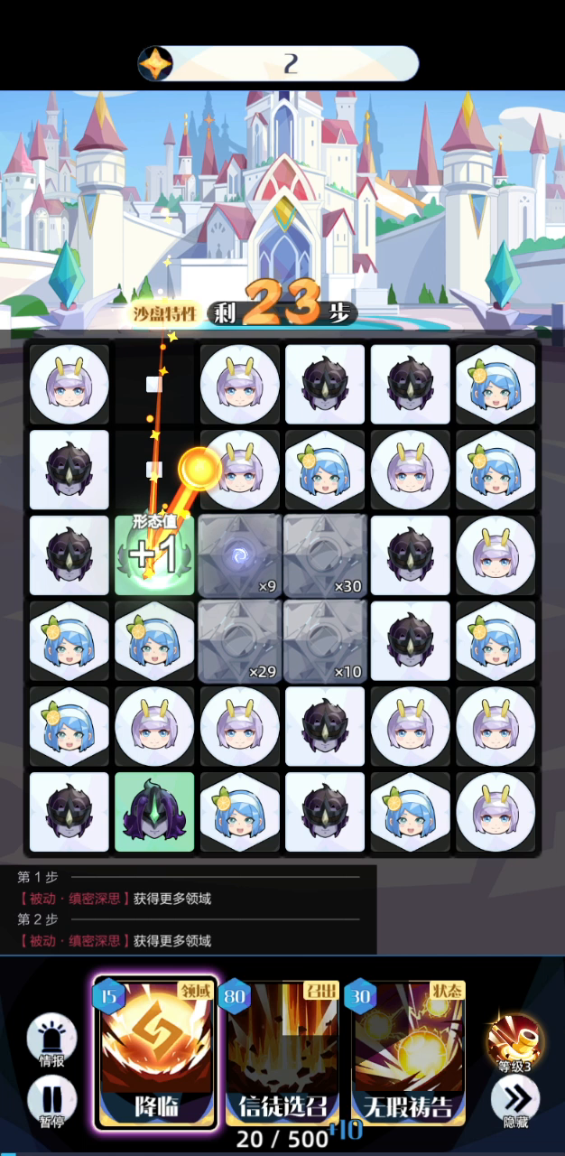 英雄:樱 技能带降临和信徒选召 1.开局随便消,清掉石头,最好能提升烟斗等级 2.等能量满后用降临铺满领域 3.沙盘特性加10点能量,可无限使用信徒选召