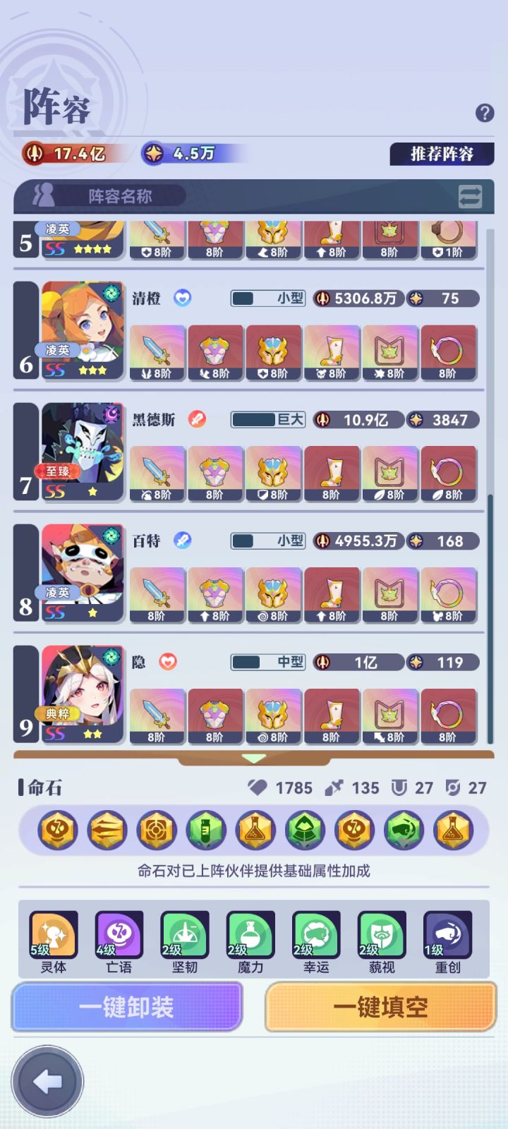 赶在新年前通关了,芝打图还是强,不然不知道还得熬多久,光殿550,伙伴2450,装备2990,27.9兆,主用1050那套,卡关就用倒数第二套,1414过完到通关就用了一天。1497看黑大帅的攻略,新增的最后一套,感谢群里的大佬指导及论坛的大神哈。(ps附最后一图我觉得战力最夸张的一关)