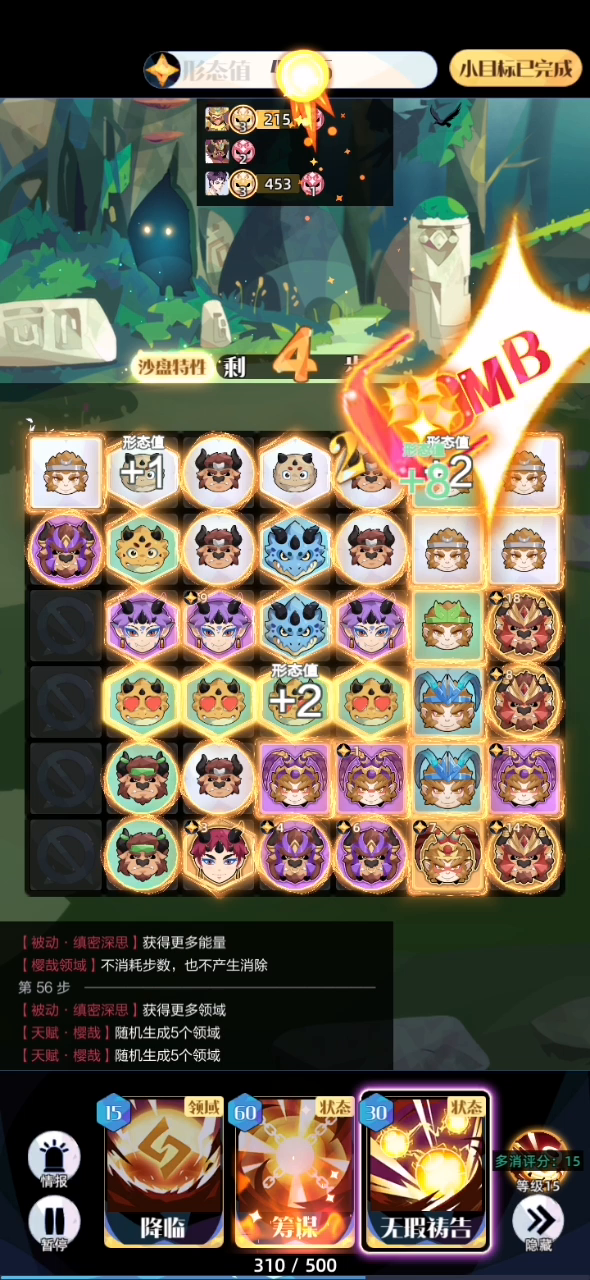 一步合成五紫四橙带一个四紫,利用L型合成在拐角处的机制。 横着摆五紫就放不下第二个四紫了,想摆出这一步还是花了点时间