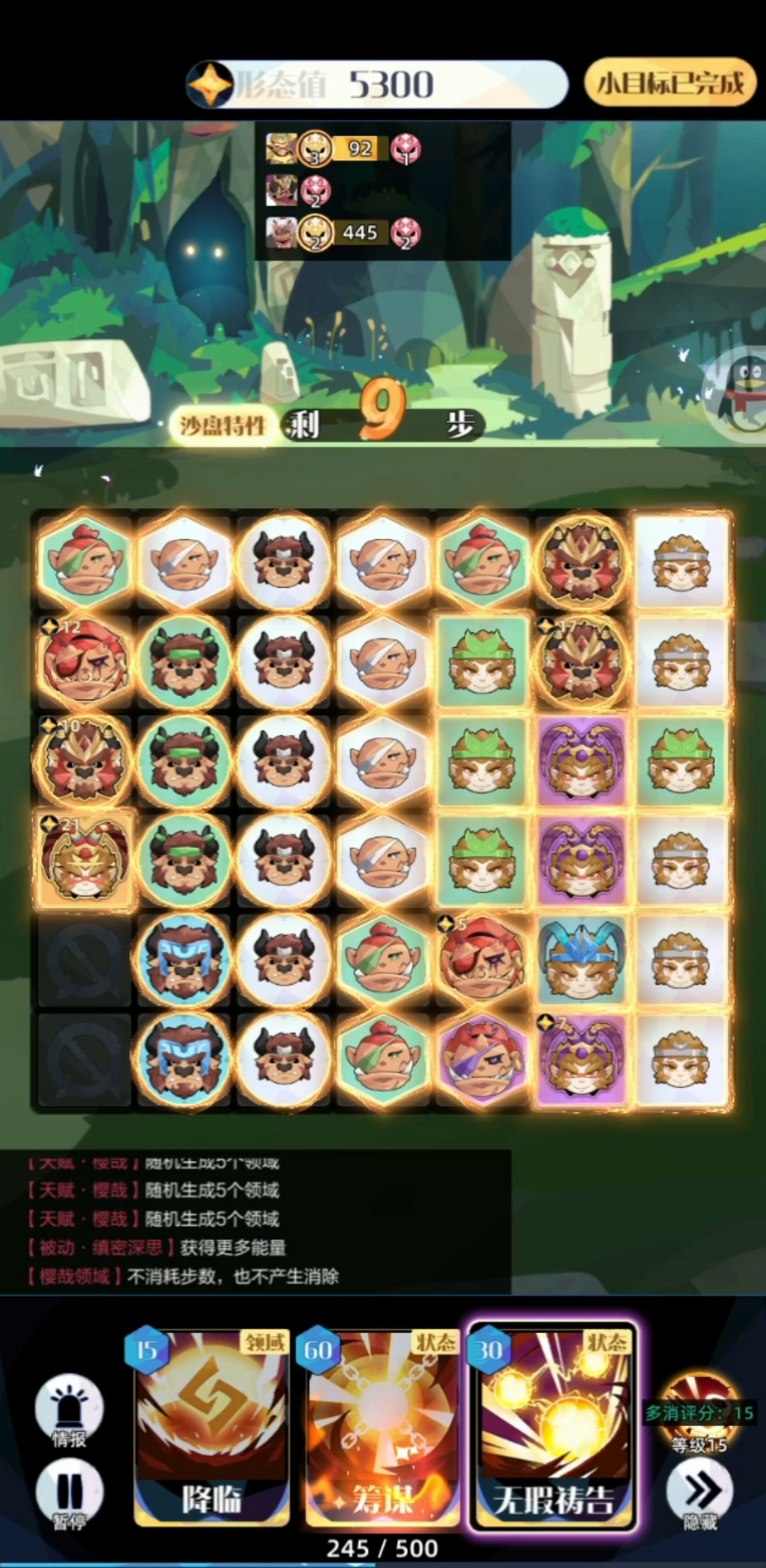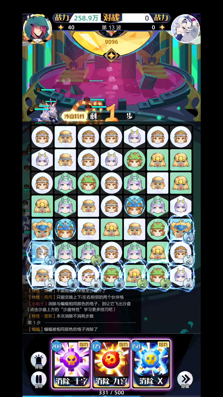 练度:冰芯灵3S4星、亚巴顿SS5星、黑德斯SS5星 神器:未升级、未升星 英雄全体状态值加成:152.4% 英雄:樱哉 技能:降临、无瑕祷告、信徒召唤 多消四个及以上伙伴格 使用无瑕祷告增加领域 达到13个起 使用降临召唤伙伴 初期合成到紫色品质使用技能召唤 后期蓝色品质即可召唤 光圈(领域)覆盖大量格子之后 拖拽到沙盘外不会清除领域 伙伴格子交换位置清除领域 进入下一步移动伙伴位置消除 (忘记这个设定了……) (可以拖拽到沙盘外连消!) (两个领域伙伴格交换、领域和无领域伙伴格交换) (都会清除全部格子上的领域)