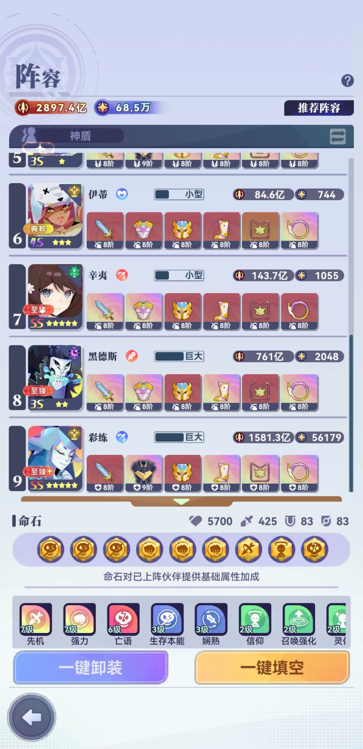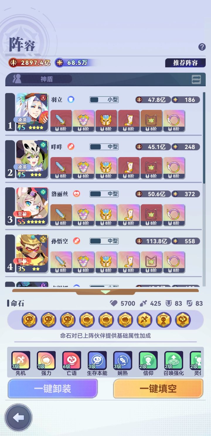 赶在新年前通关了,芝打图还是强,不然不知道还得熬多久,光殿550,伙伴2450,装备2990,27.9兆,主用1050那套,卡关就用倒数第二套,1414过完到通关就用了一天。1497看黑大帅的攻略,新增的最后一套,感谢群里的大佬指导及论坛的大神哈。(ps附最后一图我觉得战力最夸张的一关)