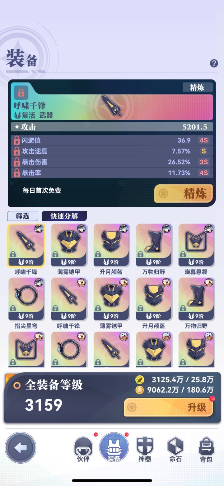 游戏到了后期,背包的装备经常爆仓,一下子堆到2000以上,建议将需要的装备锁住,然后剩下的一键分解,比一件一件装备分解节省很多时间,只需要留4词条的幻古装备即可