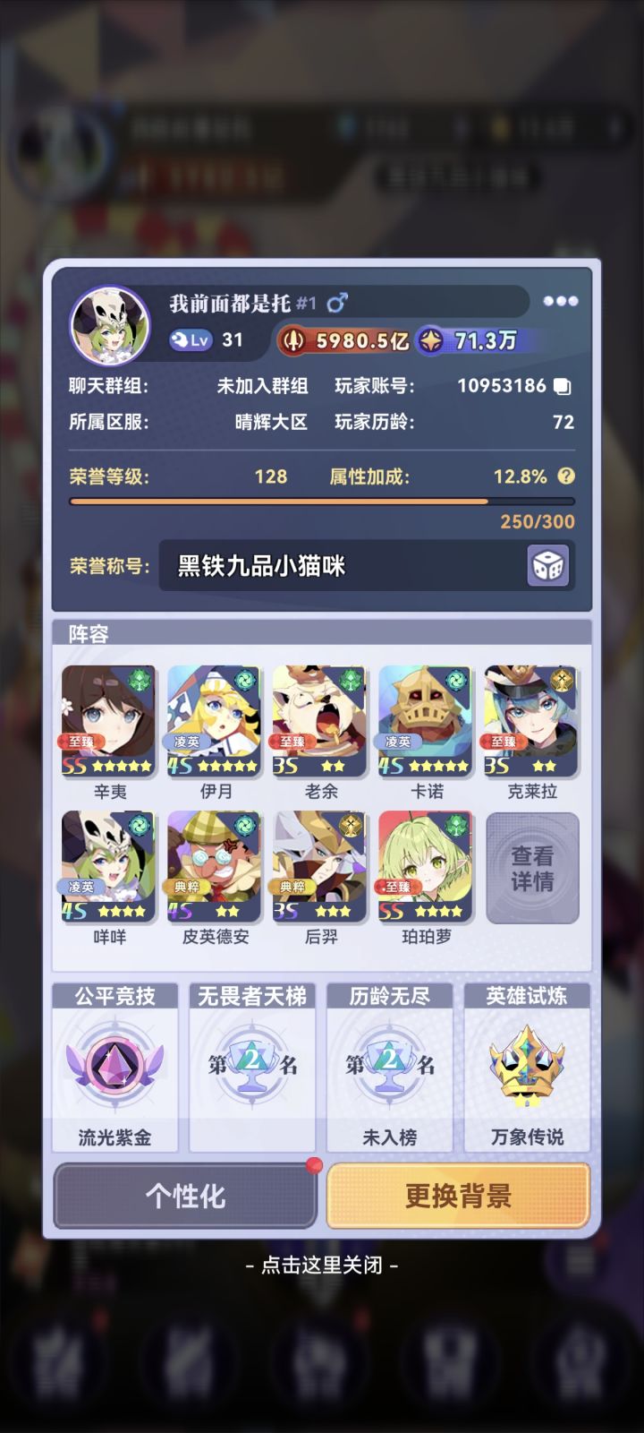 已经玩了42天,发现游戏里和论坛中关于游戏新手的养成和玩法的分享攻略很少,论坛活跃度也不高,所以想和大家分享一下我这一个月的游玩心得与阵容!的话不多说上图。充了俩块钱,但是玩过的都知道这游戏充俩块和零氪一样哦,所以大家可以当零氪分享来看。乘这次彩练up直接把战力拉到了快1000亿!,彩练是对冒险提升最大的伙伴,有了她我们可以越战20多倍来推冒险,有这个时期入坑的萌新可以放心大胆抽!!祝大家欧气