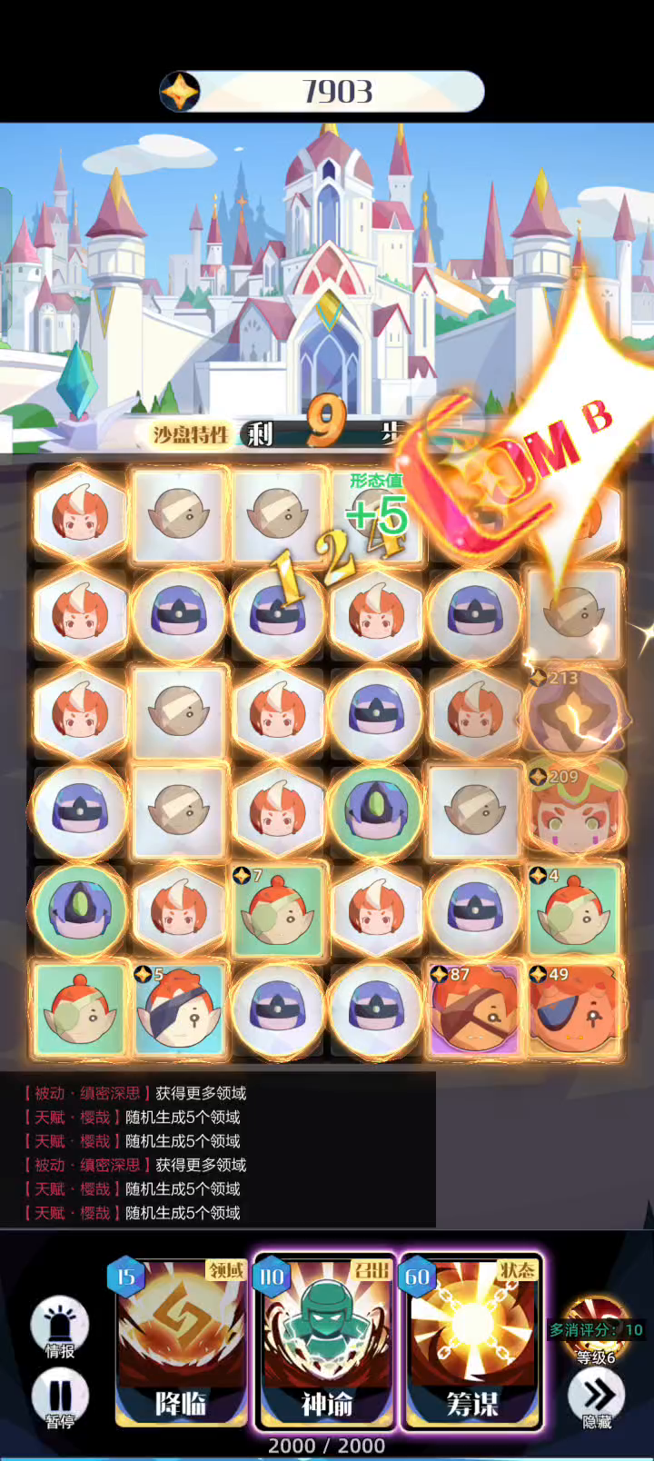 前面猥琐消除,一定要以升级被动为目的,在被动到达九级 十级之后,在考虑多消情况下连消,在此之前一定要尽量多消升级被动。 在沙盘比较杂乱,但是能进行较多合成的时候,降临+筹谋直接拉满,然后清空沙盘+合成大怪。 视频是我想合一次4个史诗把被动升级到11级,然后发现这不是我的沙盘,我在推图😂还谋划了半天。