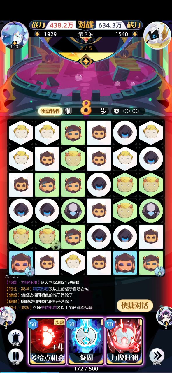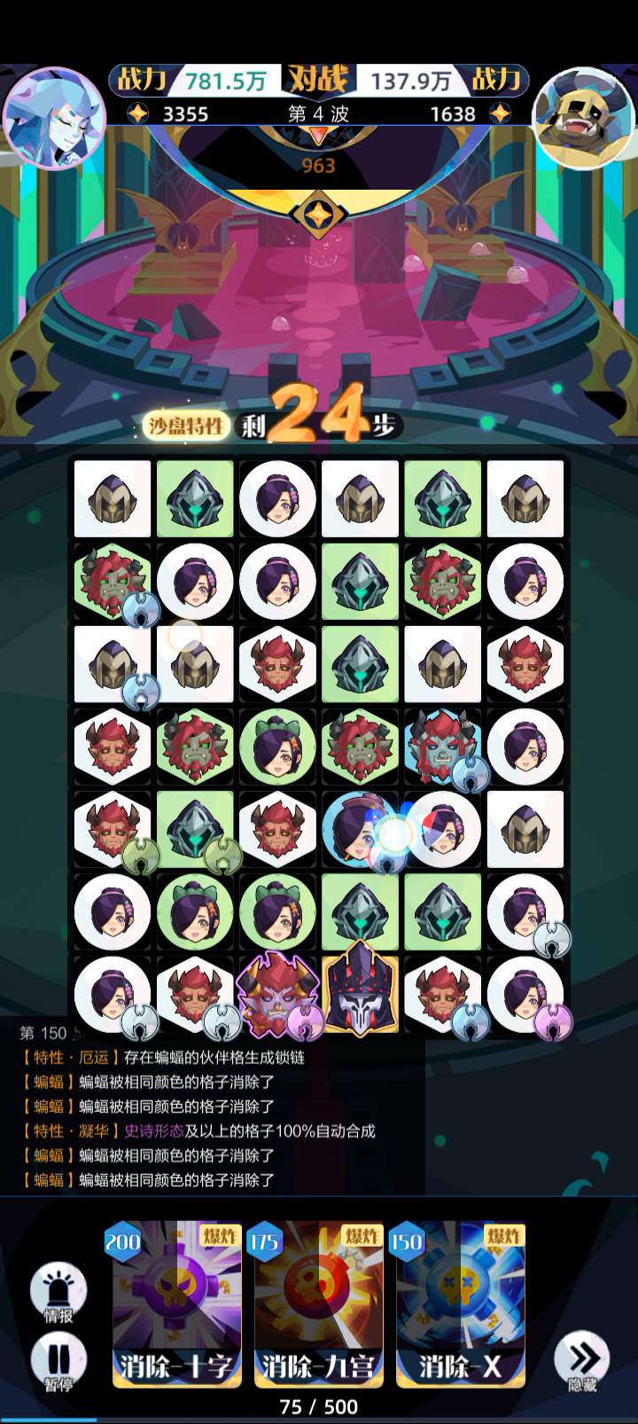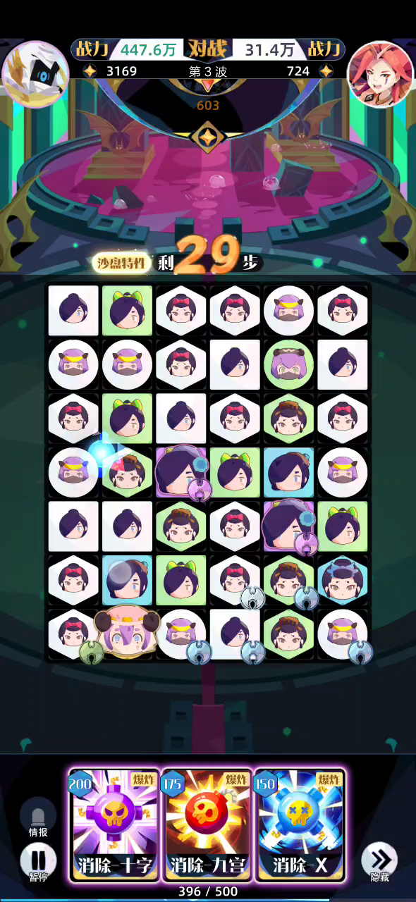 这关的核心思路就是使用快意癫狂配合领域把伙伴升到绿色,然后再直接用技能9合1出一个紫。由于这两个技能都需要领域,所以这关对于领域的需求量特别大,那么我的做法是用磷火占位,并且拖出领域内的伙伴来触发被动增加领域,这样子的话每一波有11个领域,沙盘我留了16格,可以达到很高的覆盖率。