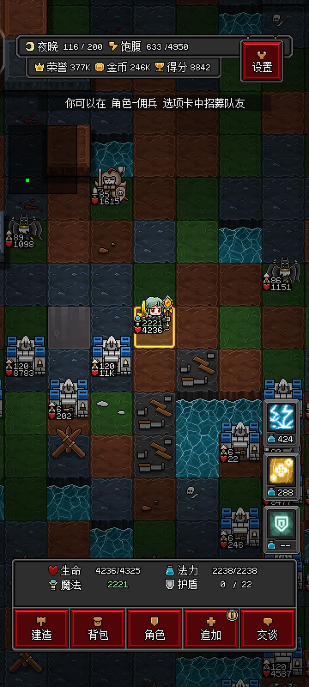 游戏挺好玩,但是没有引导,虽然我只玩了几个小时,还是写一篇攻略给新手指指路。(有什么需要问的,或者更正的欢迎留言) 1,开局 开局选择哪个职业问题都不大,不过推荐选择法师或者弓箭类型武器,比较容易度过前期。 开局后第一天先不建基地,第一天尽量收集物资。第一天夜晚会刷怪,不要管继续采集,怪靠近就放几个路障,怪会自己撞死。收集到足够物资准备第二天建城。 2,建城选择 第二天白天再采集一天,晚上准备建城