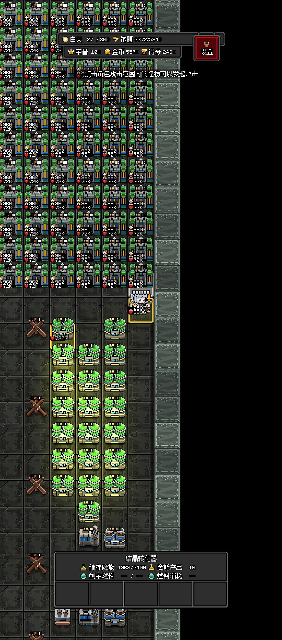 游戏内很多机器都需要魔能,魔能可以通过一些机器产出(后面会讲),点击机器显示的绿色范围就是这个机器传输魔能的范围,一台机器只能在这个范围内向别的机器传输,别的机器要往这台机器传输魔能也是一样。 需要使用魔能的机器一次会往里面传需要用好几回合的量,例如满级矿机回合要消耗360魔能,传输魔能的机器就会往里传好几回合的360。 魔能机器传输并不平均 这里用结晶发生器举例 如果只有一台建筑传输魔能,就算魔