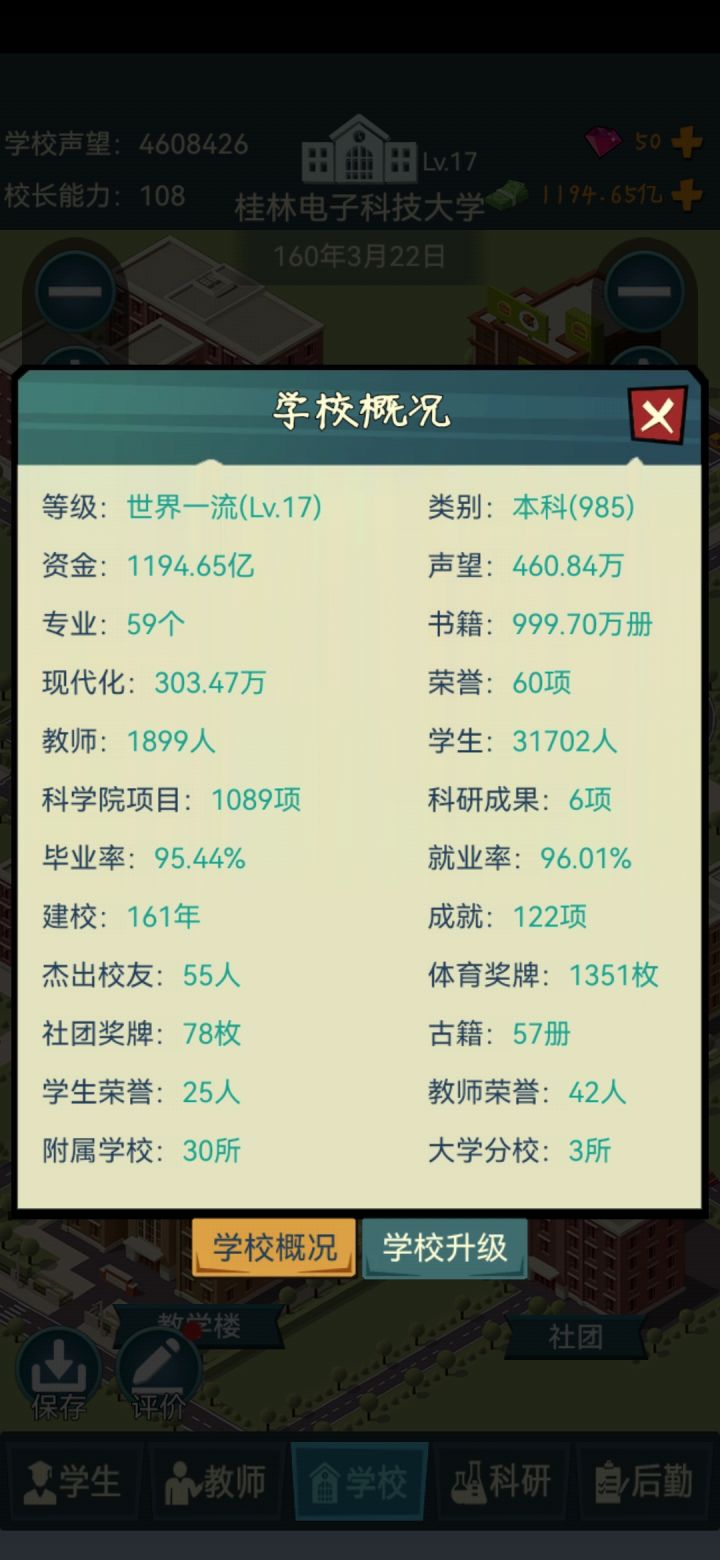 后期:开始研发后就发现真的缺钱,如果你中后期有足够实力,那就很好发展了,优先发展长生不老可以实现教职工延后退休。人事团队方面多给点钱招后勤和教师。这样子你的请假比较高,我现在已经升到9评分了。提升学生进入分数线。