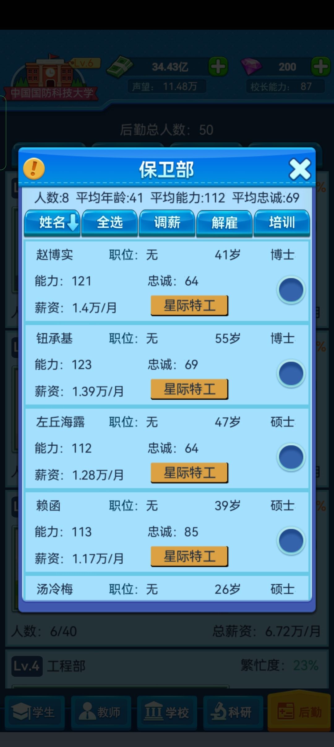 玩了二天通关到上面来吹吹水, 前期用钱背(每高一级加500万的广告)反正我前期一直亏基本每个月不看广告就会破产!,后期钱多的用不完, 中期熬等级!15级就是起飞的时候!(附属学校) 厨师优先厨艺(7级厨师3项157是最好的) 后勤每种特殊技能人员养一个就行 教师前期保持在绿色,后期拉800以上的教授 专科拉最高的钱最低的分,压力400 本科拉最高的分最低的钱压力500 硕士拉最高的分最低的钱压力600 博士 压力700(低于96的数值扣声望) 图书馆1000万策翻新最多10亿 20个藏书每个有1个就行 科技馆全外聘(自己培养麻烦)只要174能力以上的年轻人 校长能力不知道有啥用 体育馆是中期的摇钱树