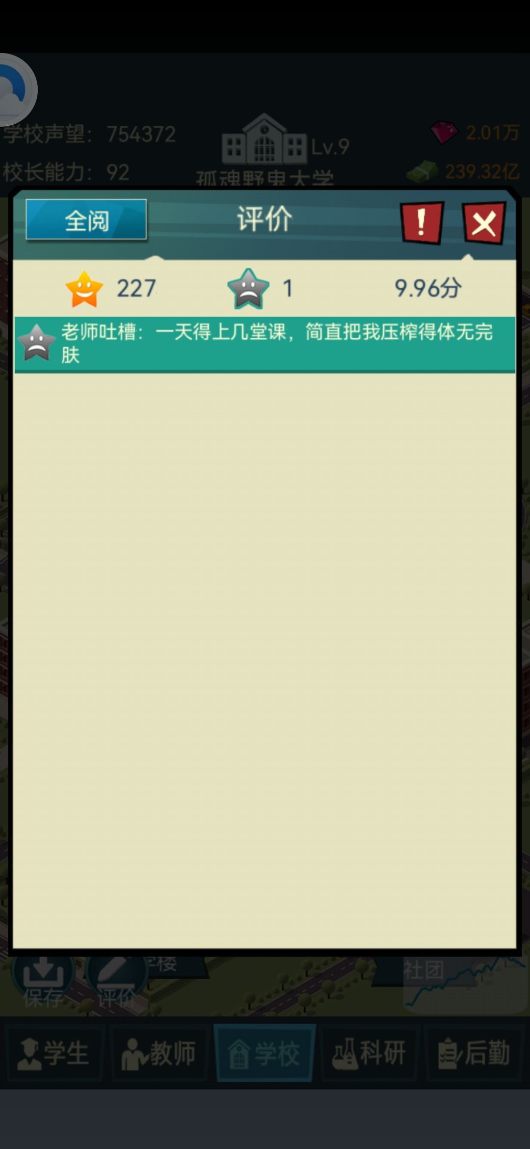 话不多说有图有真相,这号倒霉人事招聘次数为1,我一次性解雇所有讲师又没注意才有的。这个还是免广玩家用比较好,因为资金没有多大问题 评论差评重点: 1.餐厅 开局升炉灶,研究室和工厂,工厂满级出山开研(保成功率),注意有时也得改良,差评有关于菜品质量问题的,不幸触发过。二级餐厅可以对外开放,不推荐,尽量不要开放,因为烦忙不宜高影响好评率的。升7的好评率需要90以上,而且后期好评还比较难提升。但如果你