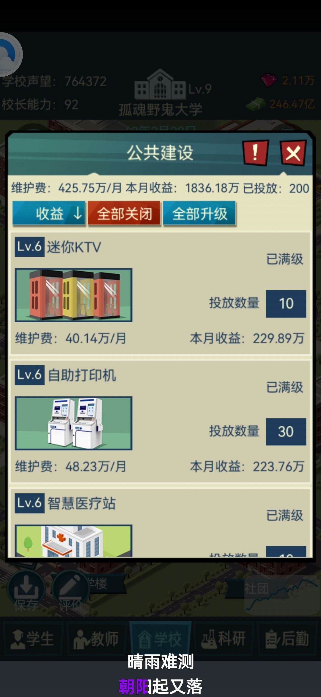 以下攻略解惑为主,会让你少踩坑,但有可能会影响游戏体验 看此贴前先去隔壁看大佬的长攻略,这边只是作为攻略的补充 ----------------🌸🌸🌸--------------- 🌸1.首先收入来源前期靠广告,中期靠餐厅和学费(餐厅平均2亿,学费平均1亿) 真的,前期就是靠吃广告度过(直到饭堂投入使用),公共设施前期是真的赚不到,饭堂40个炉灶都满级了,公共设施才只能做到勉强收支平衡,有限的钱花