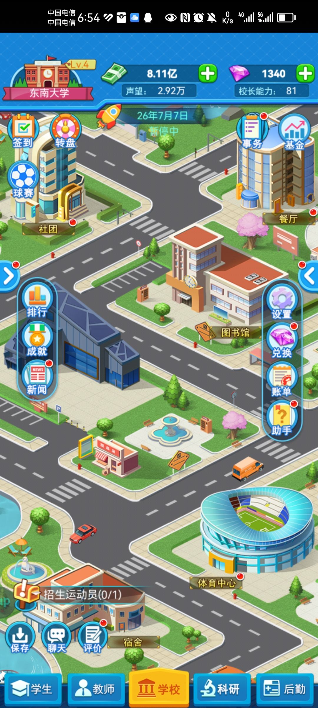 1.用6倍速肝了3天,应该玩到中期了吧,还有几个专业没开,科学院没满级,看了好多多多多多多广告,官方你怎么只统计前几十个广告的数量后面看的不统计了,缺钻石了。 2.破产过一次,因为本科专业一下子全开,要建设宿舍楼、教学楼、办公楼、招老师,资金不足破产了。 3.第二次慢慢来,按照升级要求、找攻略看升到了985,但还是缺钱,没搞懂问题在哪,或许是钻石兑换加成?我给餐厅、体育中心兑换了3次也没见涨多少,