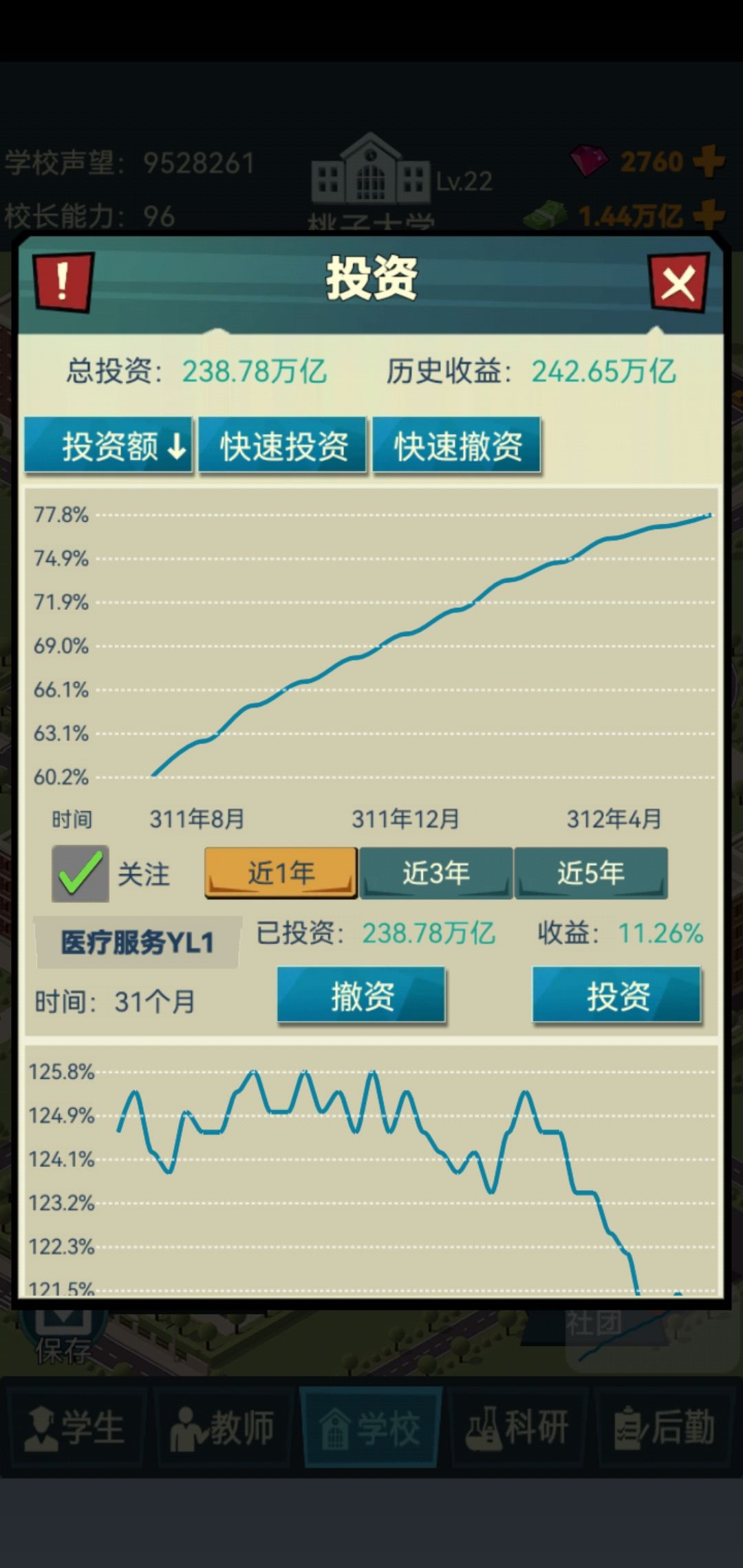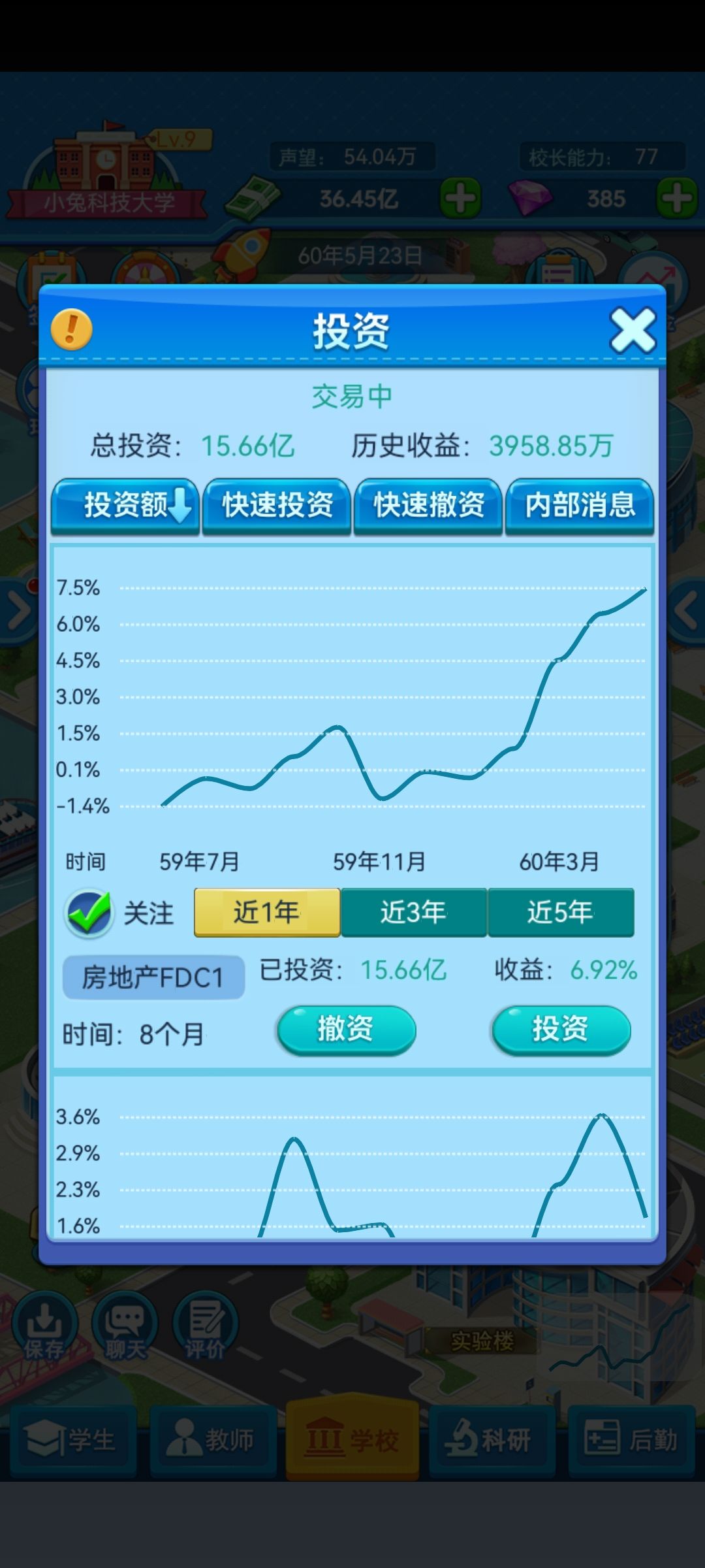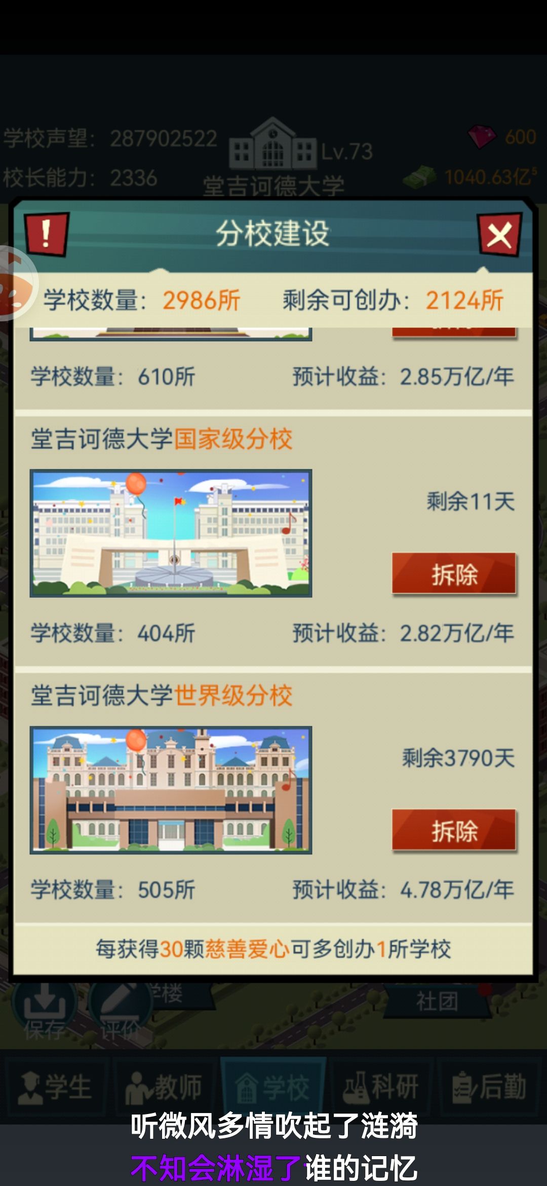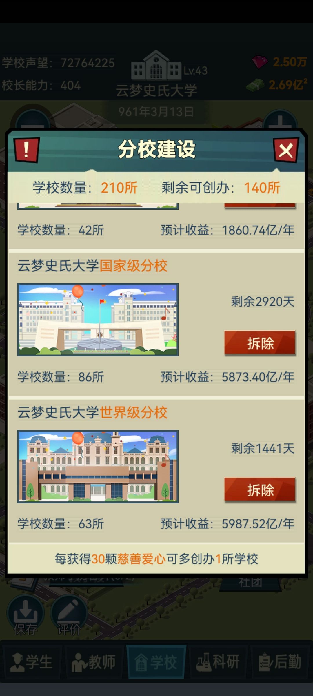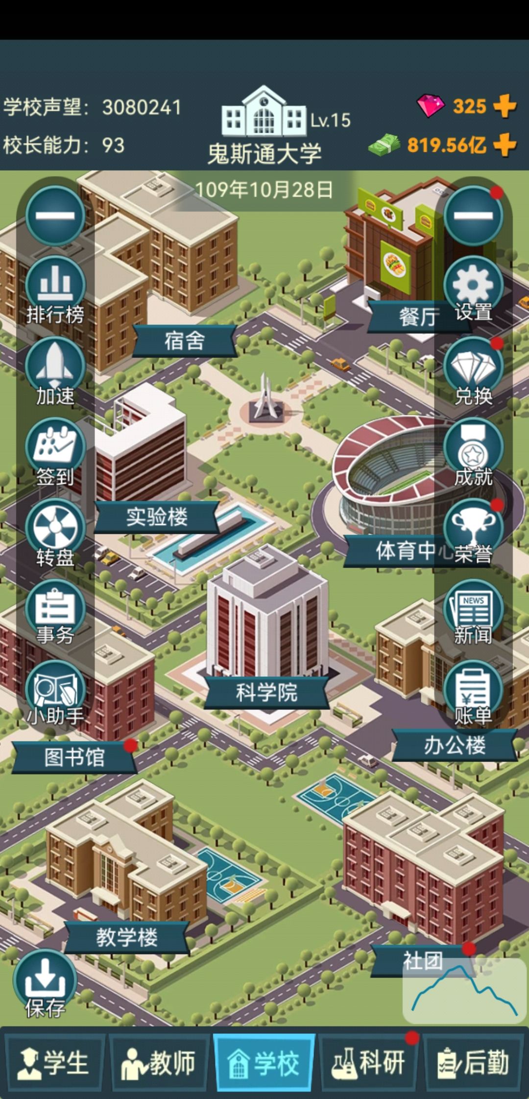 办公楼和教学楼只建八个就行了,全部升满级,不需要搞设施(完全是因为特别麻烦,而且加的分也不高🐒),这样你的老师也够地方坐了,学生也够了(小技巧:老师打开招聘,然后全选之后,应聘的正正好好就一千人左右,全选,完全不需要培训,每个学期扣的声望不达50,懒人最爱,培训的都是吃饱闲的🐒然后就不要继续招了,等他全部退休完,对,就是一个不剩之后再招,非常的舒服🐒)