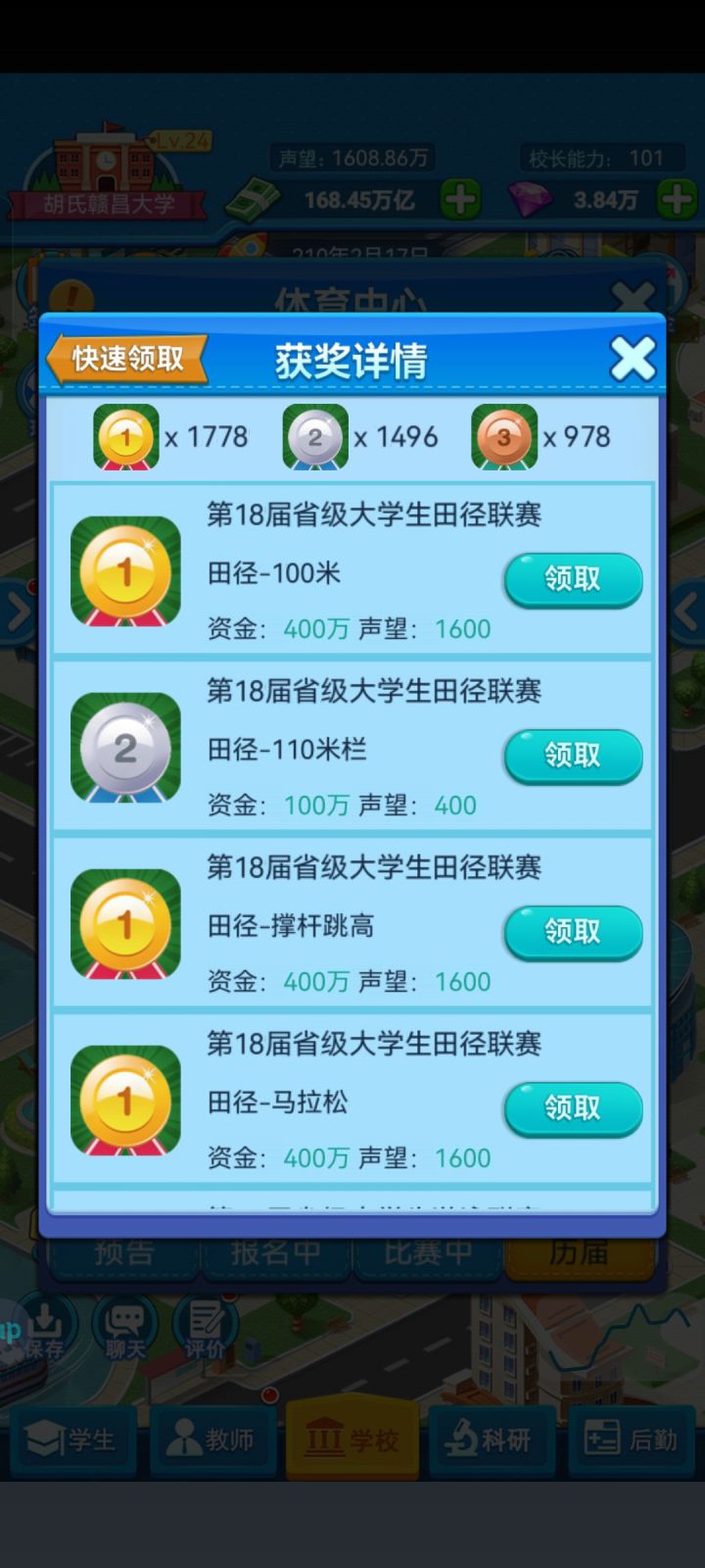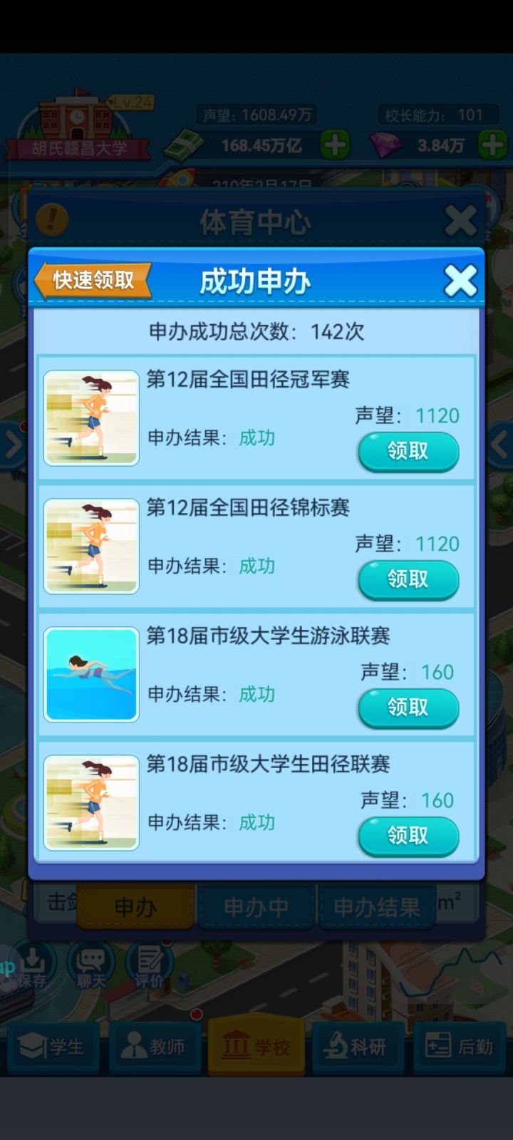 6.体育馆也是不可缺少的前期必需,升级需要的声望大部分都靠这个建筑,先把每个体育场都建一个,然后都创个战队,只招一级体育生和一级以上的国家级和国际级,剩下的都是没用的,招到后要定时训练,前期的钱够用但不要第一年就建,最好等钱存到7到8亿这样。