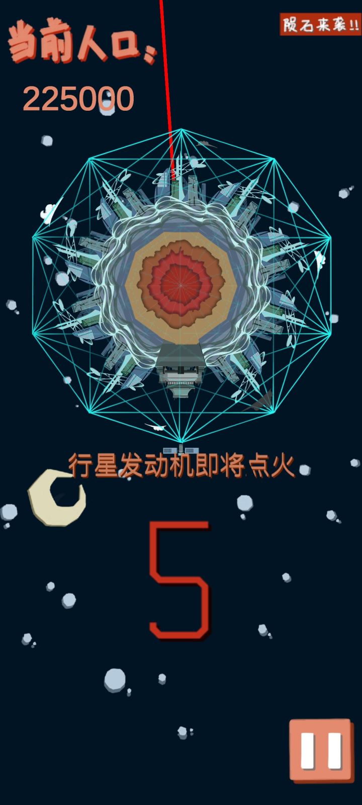不过开发者的话里面写了“因为我选择了错误的方向所以导致了游戏的失败,以后大概率不会更新这个游戏了”玩了一会,通关了。感觉还是蛮不错的。我觉得甚至可以启动了发动机开始逃离后也不是结束,而是可以操控星球的方向继续躲避各种星球陨石。甚至可以加入引力这一概念,你会被大的星球吸引而你要躲避,小的星球可以被你吸引,你可以加速甩开或者维持速度让它成为你的卫星。最后到达一个合适的星系原地发展,不过这个时候不是